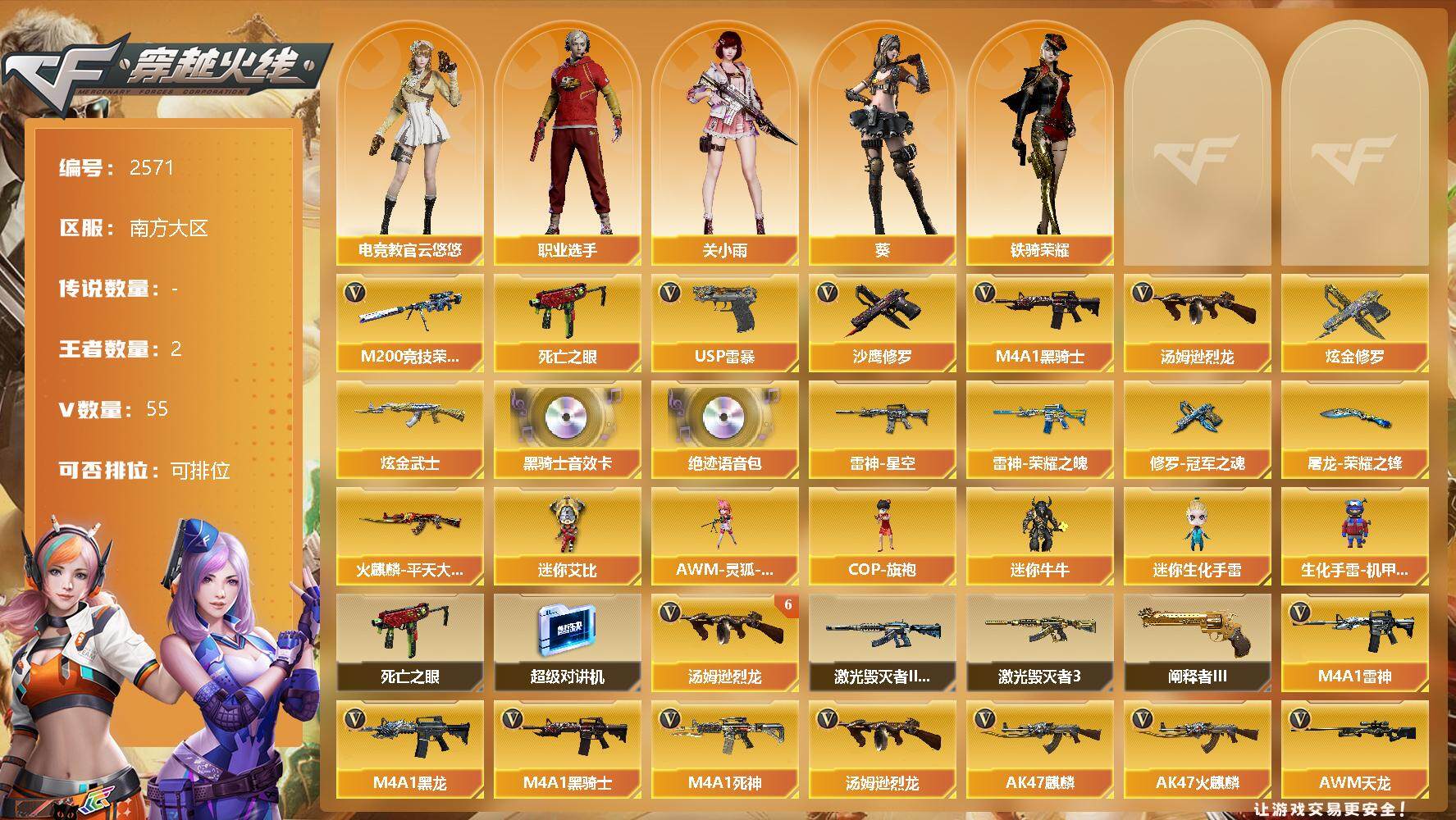 [12281419]【商品标题】:南方大区-55V-2王者-3炫金 【热门武器】:M200-竞技荣光,死亡之眼,M4A1-黑骑士,汤姆逊-烈龙*6,USP-雷暴,沙鹰-修罗 【王者炫金武器】:炫金修罗*2,炫金武士 【音效卡】:M4A1-黑骑士音效卡,绝迹语音包 【稀有皮肤】:雷神-荣耀之魄*2,雷神-星空,火麒麟-平天大圣,修罗-冠军之魂,屠龙-荣耀之锋 【角色】:葵,电竞教官-云悠悠,关小雨,铁骑荣耀,职业选手 【人偶武器】:AWM-灵狐-15周年嘉年华,COP-旗袍,迷你艾比,迷你牛牛,迷你生化手雷,生化手雷-机甲核心 【暴走生化】:死亡之眼,超级对讲机 【挑战大师】:阐释者III,激光毁灭者III,激光毁灭者III-白马银枪 【英雄级武器】:M200-竞技荣光,柯尔特-竞技荣光,擎天-竞技荣光,高爆手雷-竞技荣光*5,烟雾弹-竞技荣光*6,闪光弹-竞技荣光*5,USP-雷暴,无影-神兵利器,M4A1-雷神,M4A1-黑龙,M4A1-黑骑士,M4A1-死神,汤姆逊-烈龙*6,AK47-麒麟,AK47-火麒麟,AWM-天龙,Barrett-毁灭,AWM-裁决,M4A1-赤狱骑士,沙鹰-修罗,麒麟刺*2,擎天,龙啸,屠龙*4 【特殊枪械】:1黑骑士,6烈龙