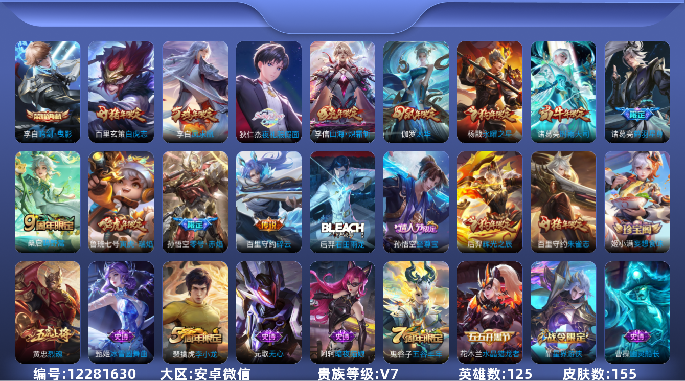 [12281630]【特价急出/详情看图】:安卓WX-V7-至尊星耀II段位-125英雄-155皮肤-1典藏-12传说-47史诗
