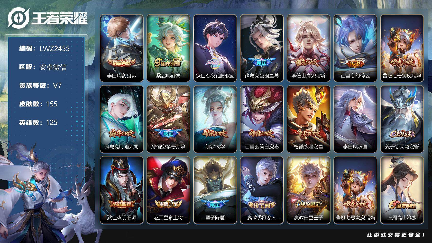 [12281630]【特价急出/详情看图】:安卓WX-V7-至尊星耀II段位-125英雄-155皮肤-1典藏-12传说-47史诗 【荣耀典藏】:李白鸣剑曳影 【传说皮肤】:桑启鸣野蒿,狄仁杰夜礼服假面,诸葛亮鹤羽星尊,李信山海炽霜斩,百里守约碎云,鲁班七号寅虎瑞焰,诸葛亮时雨天司,孙悟空零号赤焰,伽罗太华,百里玄策白虎志,杨戬永曜之星,李白凤求凰 【限定皮肤】:姜子牙天穹之誓,狄仁杰阴阳师,赵云皇家上将,墨子降魔,嬴政优雅恋人,嬴政白昼王子,鲁班七号寅虎瑞焰,庄周高山流水,元歌无心,夏侯惇朔风刀,狄仁杰魔术师,狄仁杰万华元夜,达摩沙漠行僧,项羽海滩派对,老夫子醍醐杖,程咬金演武夺筹,兰陵王金庭之子,孙悟空至尊宝,孙悟空零号赤焰,后羿辉光之辰,李元芳匿光侦查者,李元芳云中旅人,钟馗驱傩正仪,杨戬永曜之星,雅典娜黎明之约,鬼谷子原初探秘者,鬼谷子五谷丰年,诸葛亮时雨天司,诸葛亮鹤羽星尊,黄忠烈魂,苏烈千军破阵,百里玄策白虎志,百里玄策原初追逐者,百里守约朱雀志,弈星混沌棋,梦奇顽趣,沈梦溪大漠名商,明世隐疑决卦,裴擒虎李小龙,裴擒虎擒涛扼浪,李信山海炽霜斩,伽罗太华,伽罗天狼溯光者,鲁班大师探海日志,桑启海盐诗旅,暃星界游侠,阿古朵江河有灵,张良古海寻踪,狄仁杰夜礼服假面,蒙犽百解令,蒙恬荣光圣徽,高渐离燃音魔法,妲己灵卜魔法,鬼谷子天穹祈灯,姬小满妄想食味,沈梦溪龙舞盛年,刘邦剑破天穹,周瑜熔金海岸 【年限皮肤】:百里玄策白虎志,百里守约朱雀志,鲁班七号寅虎瑞焰,李白凤求凰,杨戬永曜之星,后羿辉光之辰,诸葛亮时雨天司,伽罗太华,黄忠烈魂,李信山海炽霜斩 【赛季限定】:夏侯惇朔风刀,狄仁杰万华元夜,达摩沙漠行僧,老夫子醍醐杖,程咬金演武夺筹,兰陵王金庭之子,张良古海寻踪,李元芳云中旅人,钟馗驱傩正仪,雅典娜黎明之约,鬼谷子原初探秘者,苏烈千军破阵,百里玄策原初追逐者,弈星混沌棋,梦奇顽趣,沈梦溪大漠名商,明世隐疑决卦,裴擒虎擒涛扼浪,鲁班大师探海日志,桑启海盐诗旅,鬼谷子天穹祈灯,蒙恬荣光圣徽,刘邦剑破天穹,姜子牙天穹之誓 【战令限定】:嬴政白昼王子,暃星界游侠,高渐离燃音魔法,妲己灵卜魔法 【史诗皮肤】:项羽苍穹之光,阿轲暗夜猫娘,赵云皇家上将,赵云未来纪元,甄姬冰雪圆舞曲,王昭君偶像歌手,狄仁杰魔术师,宫本武藏鬼剑武藏,孙尚香水果甜心,嬴政优雅恋人,妲己魅力维加斯,墨子金属风暴,曹操