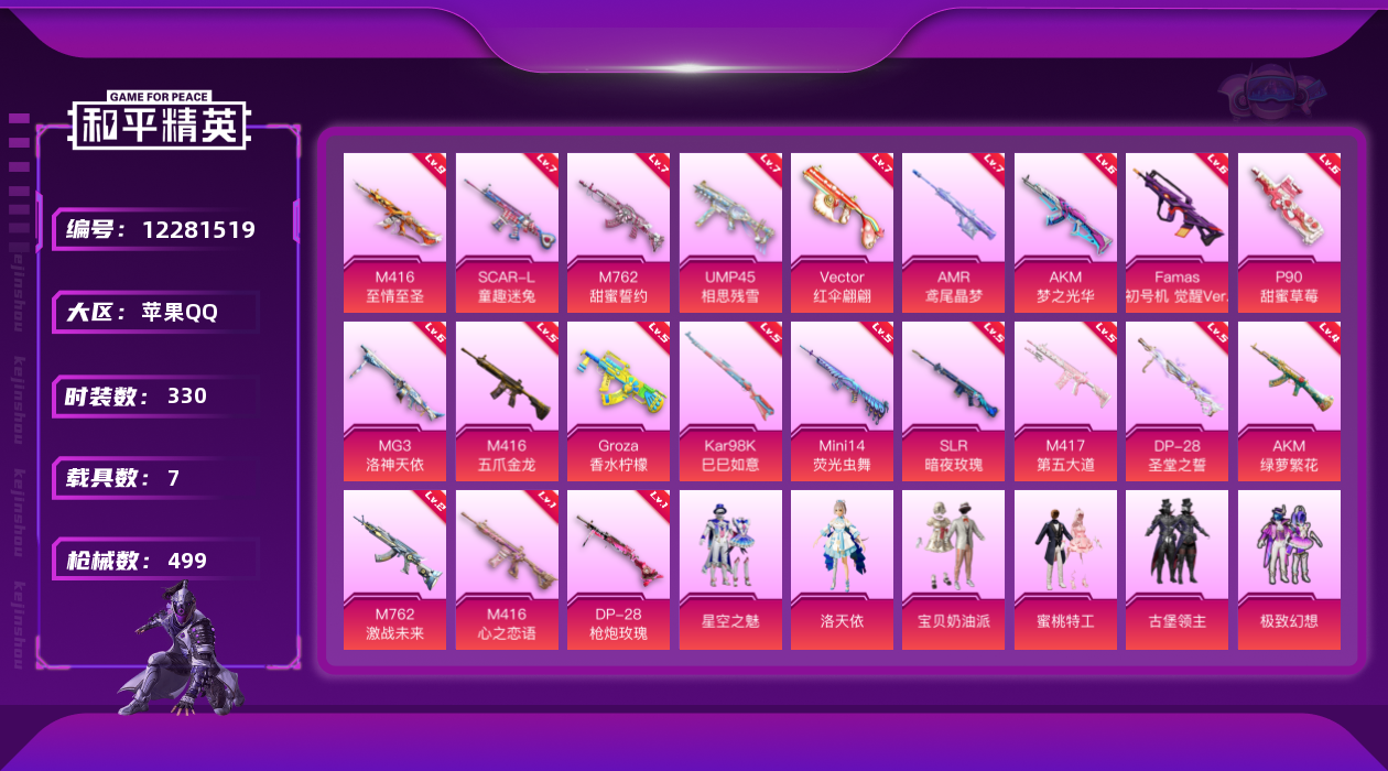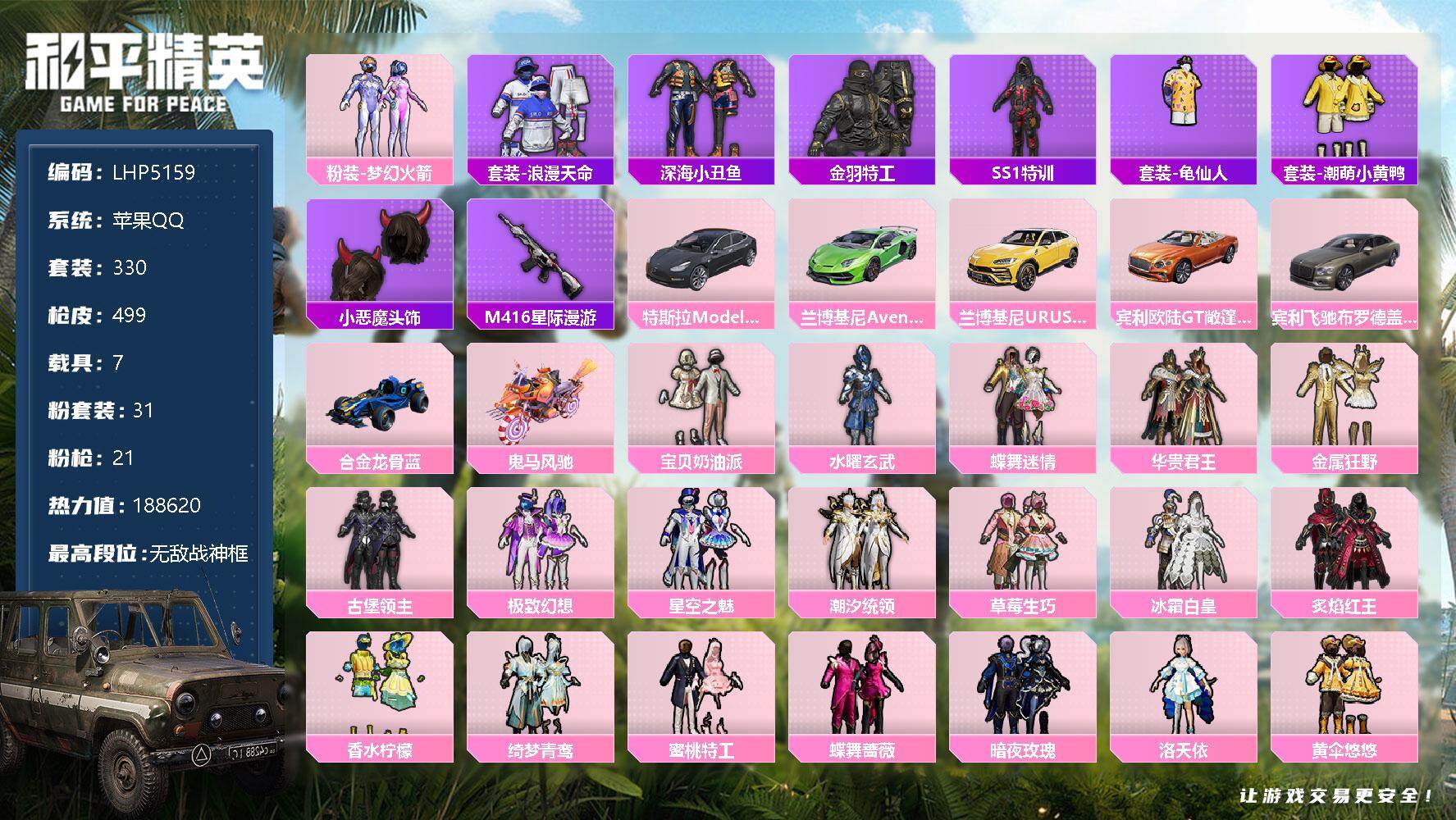 [12281519]素材身法号/无敌战神框3/绝世印记1/M416-至情至圣(九级)【特价急出/详情看图】:苹果 手Q-无敌战神框-31粉装-21特效枪-7载具-5粉色飞行器-18.8w热力值-31王牌印记-330套装-499枪皮【热门品类】:粉装-梦幻火箭,套装-浪漫天命,套装-深海小丑鱼,套装-金羽特工,套装-SS1特训,套装-龟仙人,套装-潮萌小黄鸭,小恶魔头饰,M416-星际漫游【粉色载具】:特斯拉Model 3(冷光银),兰博基尼Aventador SVJ(翡翠绿),兰博基尼URUS(明艳黄),宾利欧陆GT敞篷(火焰橘),宾利飞驰(布罗德盖棕双色),合金龙骨(蓝),鬼马风驰【粉色套装】:粉装-宝贝奶油派,粉装-水曜玄武,粉装-蝶舞迷情,粉装-梦幻火箭,粉装-华贵君王,粉装-金属狂野,粉装-古堡领主,粉装-极致幻想,粉装-星空之魅,粉装-潮汐统领,粉装-草莓生巧,粉装-冰霜白皇,粉装-炙焰红王,粉装-香水柠檬,粉装-绮梦青鸾,粉装-蜜桃特工,粉装-蝶舞蔷薇,粉装-暗夜玫瑰,角色-洛天依,粉装-黄伞悠悠,粉装-黑伞漫漫,粉装-暗星紫秘,粉装-焦糖拿铁,粉装-灵感创作师,粉装-冰川红玫,粉装-第五大道,粉装-仲夏莫吉托,粉装-拂晓神骑,粉装-闲梦青缨,角色-圣堂之誓,角色-冷漠罗丽【粉色枪皮等级】:AKM-梦之光华(六级),AKM-绿萝繁花(四级),SCAR-L-童趣迷兔(七级),M416-五爪金龙(五级),M416-心之恋语(一级),M416-至情至圣(九级),GROZA-香水柠檬(五级),M762-甜蜜誓约(七级),M762-激战未来(二级),Famas-初号机 觉醒Ver.(六级),UMP45-相思残雪(七级),Vector-红伞翩翩(七级),P90-甜蜜草莓(六级),Kar98K-巳巳如意(五级),Mini14-荧光虫舞(五级),SLR-暗夜玫瑰(五级),AMR-鸢尾晶梦(七级),M417-第五大道(五级),DP-28-枪炮玫瑰(一级),DP-28-圣堂之誓(五级),MG3-洛神天依(六级)【粉色飞行器】:春暖花开飞行器,梦幻火箭飞行器,黄族统领飞行器,祥瑞锦鲤飞行器,幻海精灵飞行器