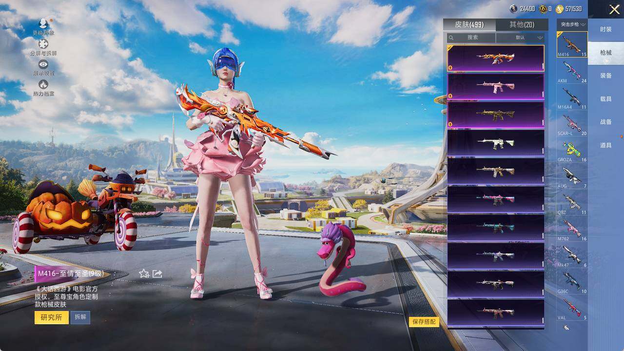 AKM-梦之光华,AKM-绿萝繁花,SCAR-L-童趣迷兔,M416-五爪金龙,M416-心之恋语,M416-至情至圣,GROZA-香水柠檬,M762-甜蜜誓约,M762-激战未来,Famas-觉醒初号机,UMP45-相思残雪,Vector-红伞翩翩,P90-甜蜜草莓,Kar98K-巳巳如意,Mini14-荧光虫舞,SLR-暗夜玫瑰,AMR-鸢尾晶梦,M417-第五大道,DP-28-圣堂之誓,MG3-洛神天依