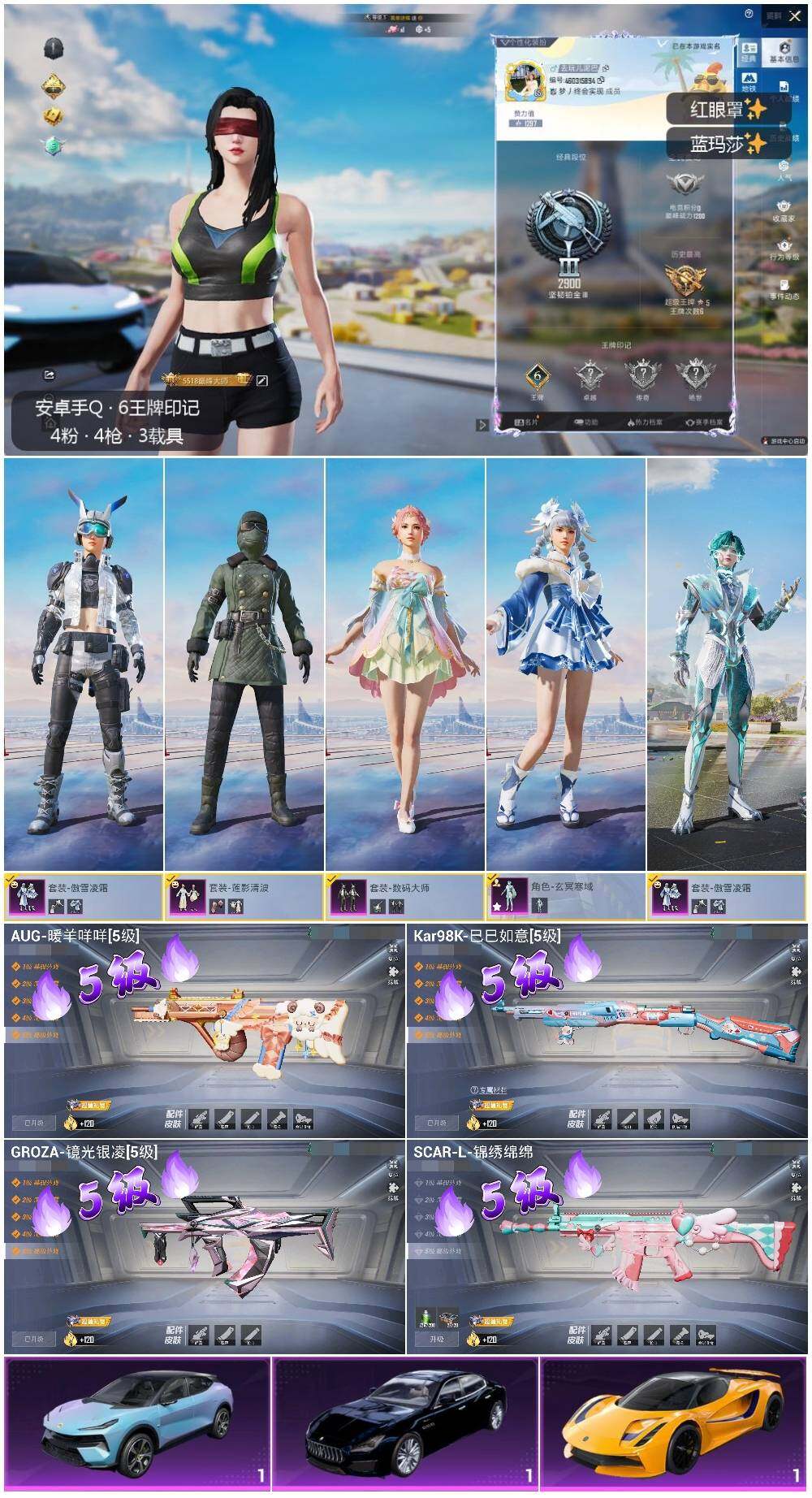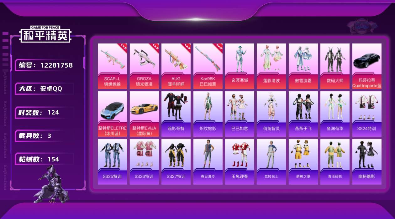 - PX_2102969- 安卓手Q-17王牌印记-7粉装-11特效枪-2载具-热力值-273套装-337枪皮-3卓越印记-1传奇印记 【7粉装】,蝶舞迷情,洛天依,绯穹魔姬,羊梦糖心,暗夜玫瑰,快乐主宰,幻影战神 【11特效枪】AKM-幽焰骑士-3级 AKM-绿萝繁花-5级 GROZA-精灵之光-3级 M762-鬼刀-7级 M762-青锋波束-5级 Kar98K-巳巳如意-5级 Mk14-精灵梦叶罗