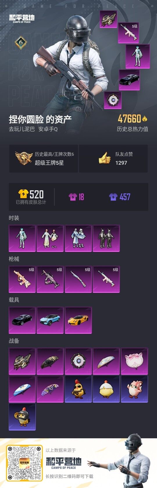 - PX_2094693- 苹果手Q-18王牌印记-7粉装-7特效枪-2载具-77484热力值-167套装-233枪皮-3卓越印记-1传奇印记 【7粉装】,梦幻火箭,幻彩电音,黄族统领,闲梦青缨,复仇流浪者,炙焰红王,音爆索尼克 【7特效枪】AKM-梦之光华-7级 SCAR-L-锦绣绵绵-5级 M416-五爪金龙-7级 Kar98K-巳巳如意-5级 Mk14-甜梦熊击-5级 UMP45-相思残雪-7级