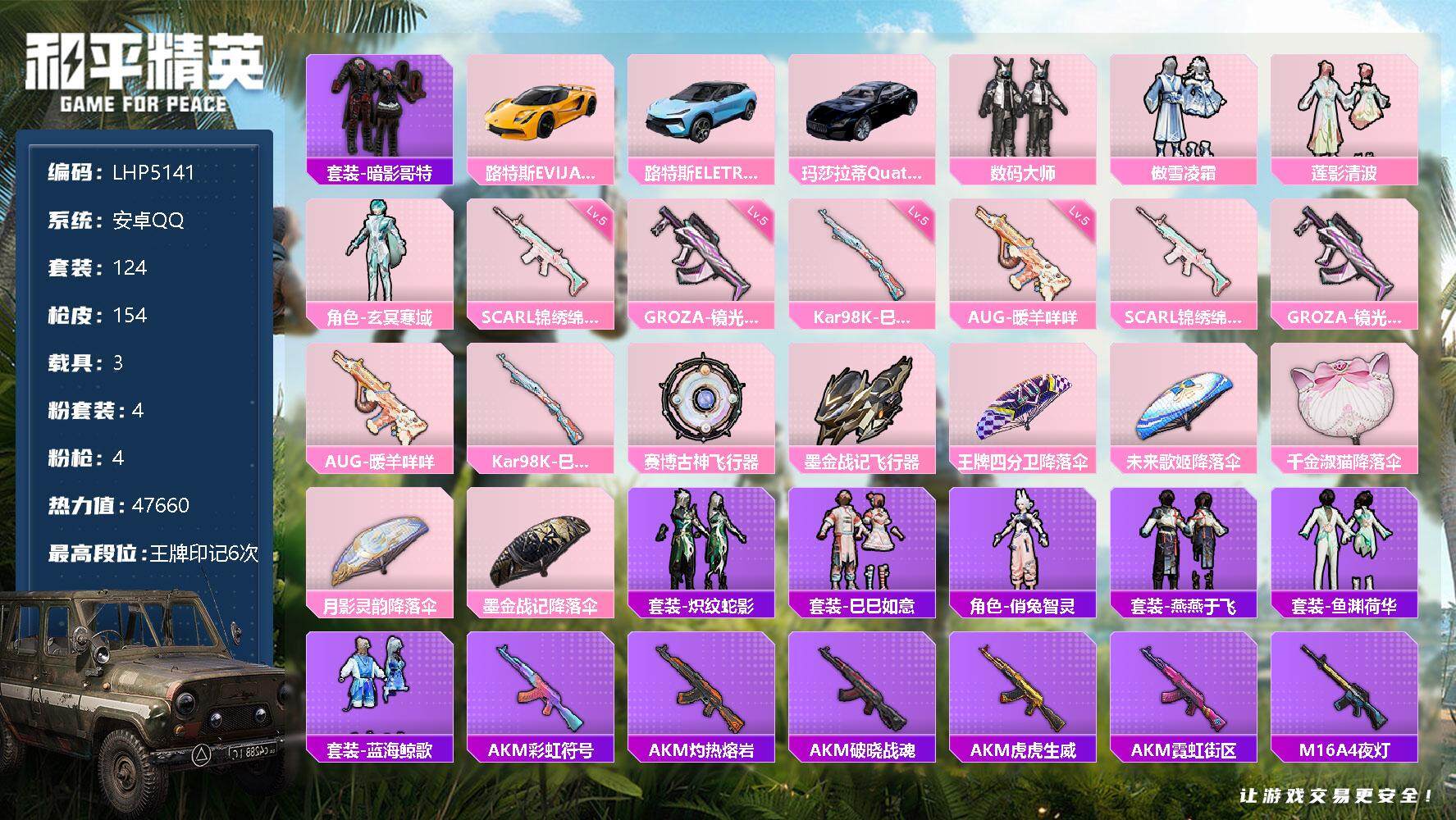 [12281758]素材身法号/扭蛋碎片552【特价急出/详情看图】:安卓 手Q-4粉装-4特效枪-3载具-2粉色飞行器-4.7w热力值-6王牌印记-124套装-154枪皮【热门品类】:套装-暗影哥特【粉色载具】:路特斯EVIJA(星际黄),路特斯ELETRE(冰川蓝),玛莎拉蒂Quattroporte(夜幕蓝)【粉色套装】:粉装-数码大师,粉装-傲雪凌霜,粉装-莲影清波,角色-玄冥寒域【粉色枪皮等级】:SCAR-L-锦绣绵绵(五级),GROZA-镜光银凌(五级),AUG-暖羊咩咩(五级),Kar98K-巳巳如意(五级)【粉色飞行器】:赛博古神飞行器,墨金战记飞行器