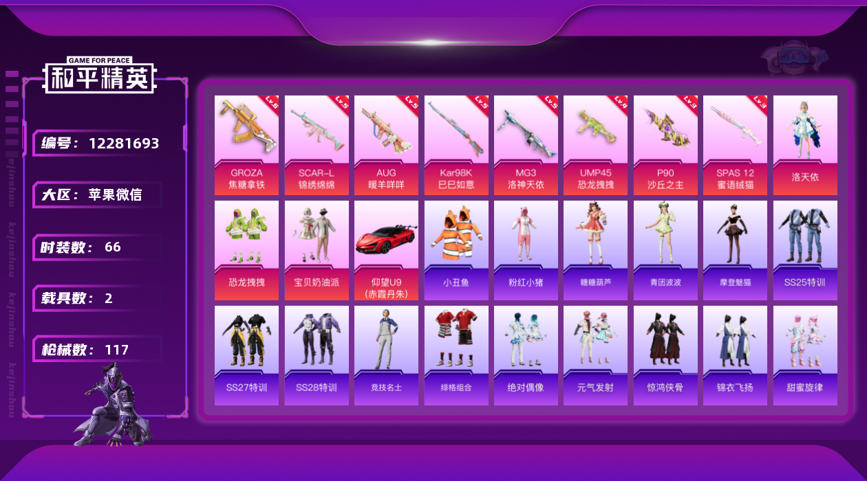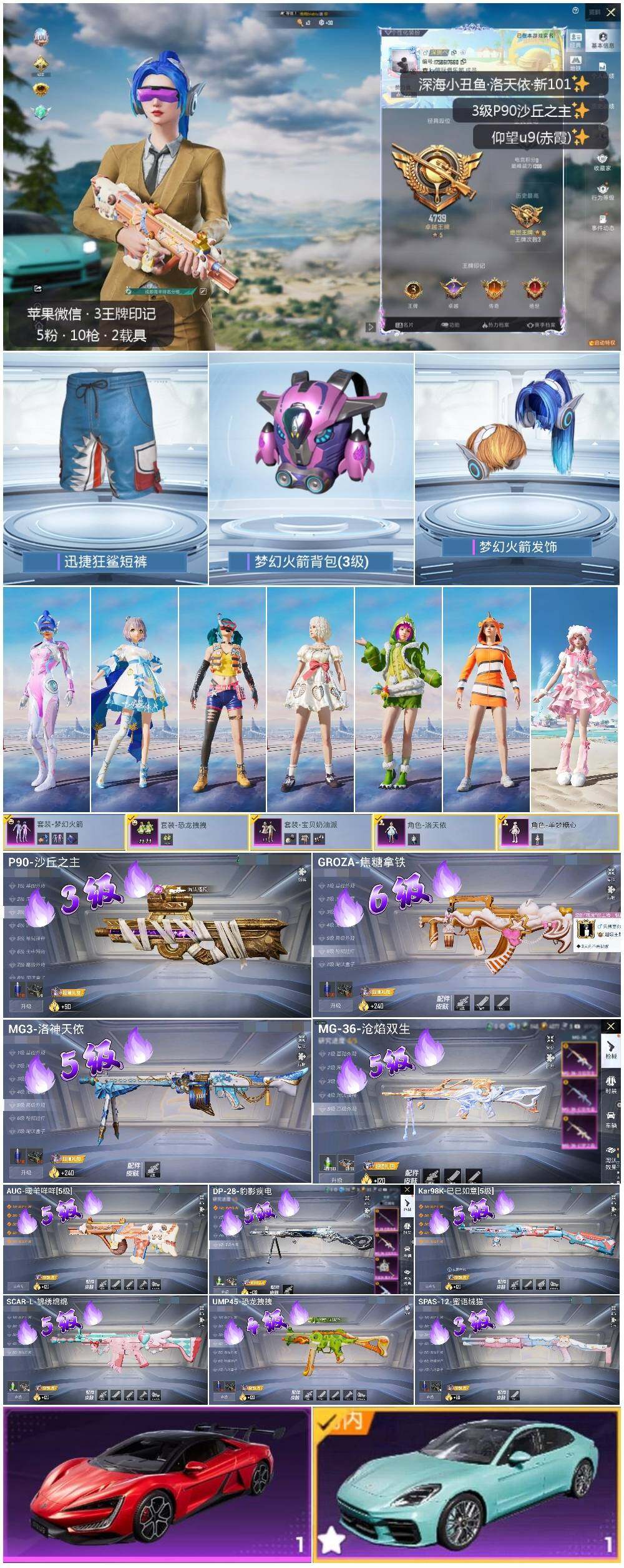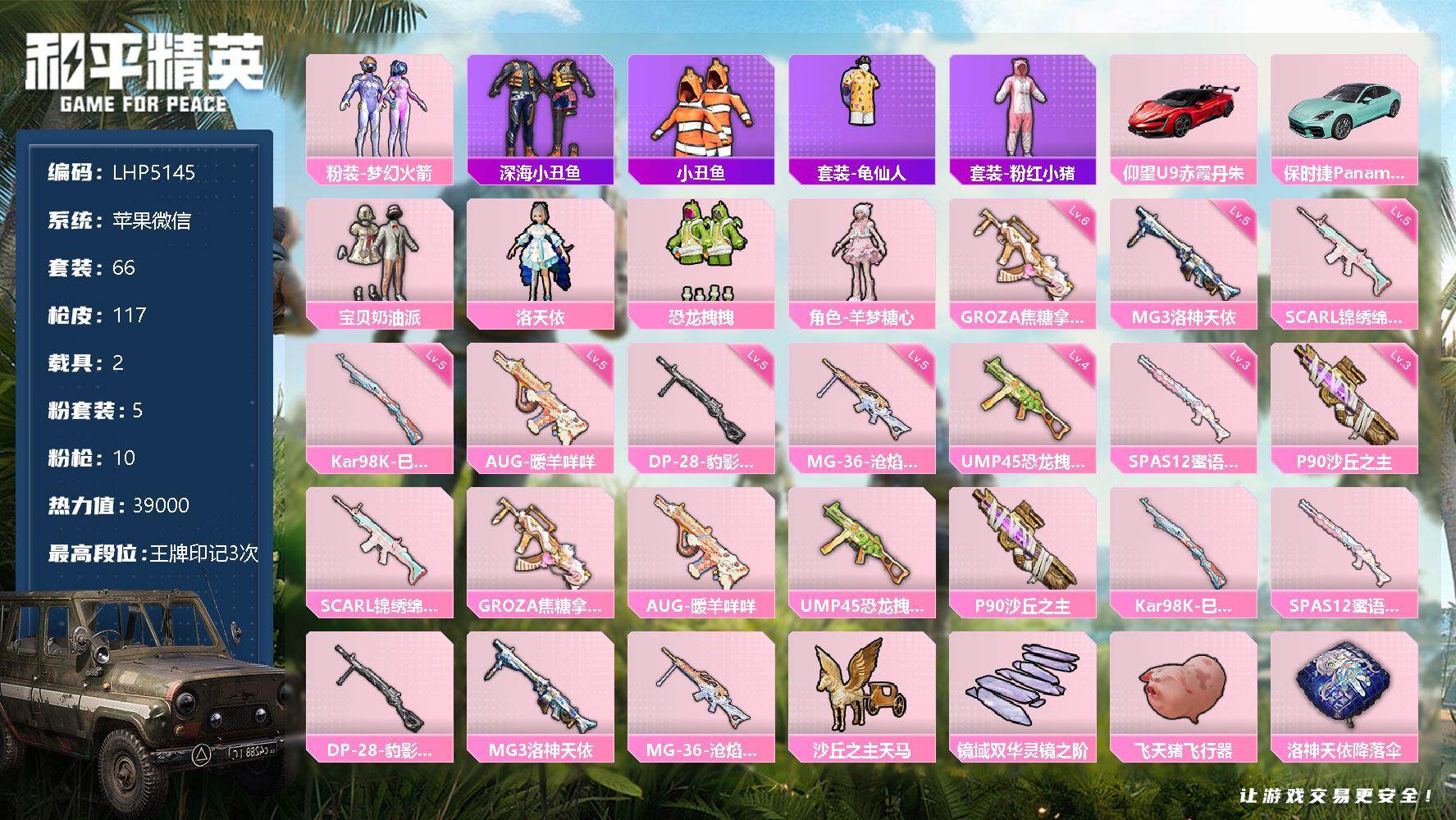 [12281693]素材身法号/绝世印记1/地铁满天赋【特价急出/详情看图】:苹果 微信-5粉装-10特效枪-2载具-3粉色飞行器-3.9w热力值-3王牌印记-66套装-117枪皮【热门品类】:粉装-梦幻火箭,套装-深海小丑鱼,套装-小丑鱼,套装-龟仙人,套装-粉红小猪【粉色载具】:仰望U9(赤霞丹朱),保时捷Panamera(梦幻青)【粉色套装】:粉装-宝贝奶油派,粉装-梦幻火箭,角色-洛天依,粉装-恐龙拽拽,角色-羊梦糖心【粉色枪皮等级】:SCAR-L-锦绣绵绵(五级),GROZA-焦糖拿铁(六级),AUG-暖羊咩咩(五级),UMP45-恐龙拽拽(四级),P90-沙丘之主(三级),Kar98K-巳巳如意(五级),SPAS-12-蜜语绒猫(三级),DP-28-豹影疾电(五级),MG3-洛神天依(五级),MG-36-沧焰双生(五级)【粉色飞行器】:沙丘之主天马,镜域双华-灵镜之阶,飞天猪飞行器