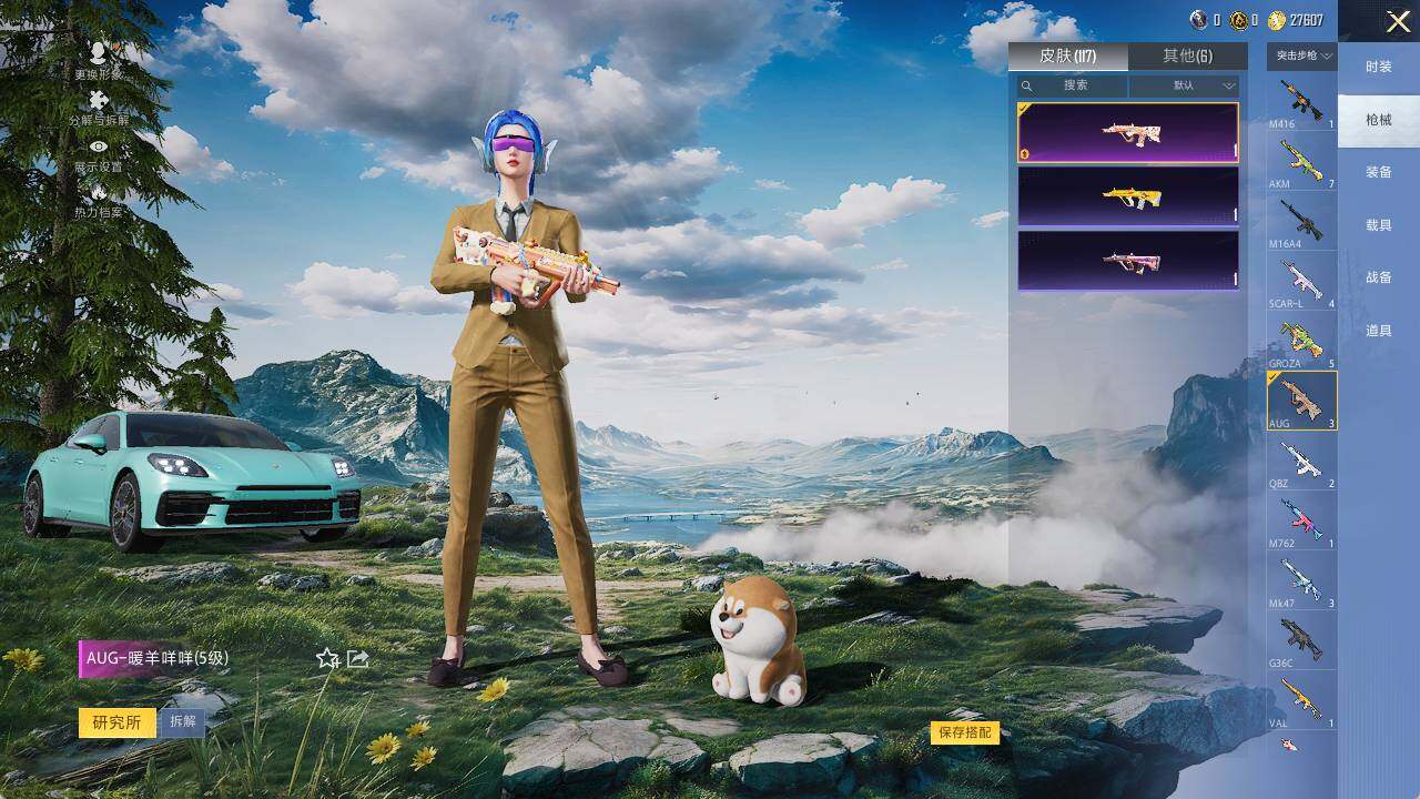 GROZA-焦糖拿铁,AUG-暖羊咩咩,UMP45-恐龙拽拽,P90-沙丘之主,Kar98K-巳巳如意,SPAS-12-蜜语绒猫,MG3-洛神天依