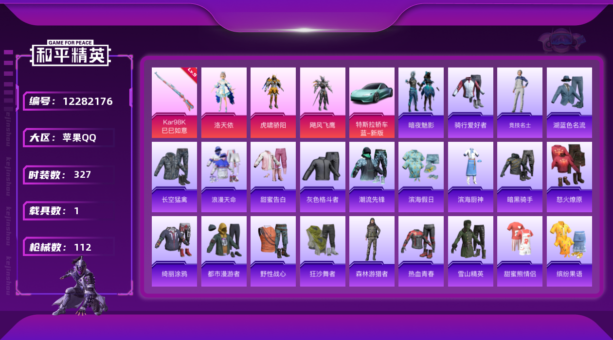 [12282176]3粉装 1特效枪 1载具 6印记 可二次 可修改实名 优质装备:特斯拉Roadster(水滴蓝),洛天依,Kar98K-巳巳如意 热门装扮:飓风飞鹰,虎啸骄阳,暗夜魅影 五级特效枪:五级Kar98K-巳巳如意 紫色装扮:田园牧歌,轻风白浪,SS22特训,飞狐塔尔斯,SS23特训,幻彩翩翩,妙红点点,娇憨猪猪,萌趣咩咩,SS21特训,SS31特训套装,冰川特警,SS20特训,SS15特训,暗夜傀儡,时空追击者,暴风机械师,SS16特训,超能拳王,治愈之星,科技之星,SS14特训,萌趣颜团子,海龙战士,飞驰魅影,音速流光,SS19特训,豚鼠丹丹,吉莉礼服,瑞龙福将,团圆交子,醒狮腾龙,SS17特训,异彩先驱,SS18特训,都市漫游者,野性战心,长空猛禽,雪山精英,霓虹极客,霓虹街区,缤纷果语,虎虎生威吉莉,骑行爱好者,麻辣教官,蝶变,香桃花海,柠萌假日,格斗先锋,暗黑骑手,滨海假日,夏日音浪,怒火燎原,探宝勇士,湖蓝色名流,滨海厨神,绮丽涂鸦,白熊同盟,甜蜜告白,福星高照,空投萌叽,甜蜜熊情侣,王牌教练,潮流先锋,牛气冲天,灰色格斗者,炫蓝之夏,热血青春,牛气满满,狂沙舞者,SS29特训,星途旅人,玉兔迎春,巳巳如意,森林游猎者,竞技名士,街头风暴,粉红小猪,浪漫天命,智谋强哥,银河圣歌,摇滚狂鲨,淡雅花蕊,浴火魔神,萌黄之夏,白糯汤圆,恋语绒绒,WiFi精灵 优质战备:星途旅人降落伞,橘柚倾心降落伞,临安公主降落伞,旋转彩虹降落伞,彩虹甜喵降落伞,梦幻火箭降落伞,星之信仰降落伞,香水柠檬降落伞,银刃赛罗降落伞,焰龙焚天降落伞,蓝莓炮弹降落伞