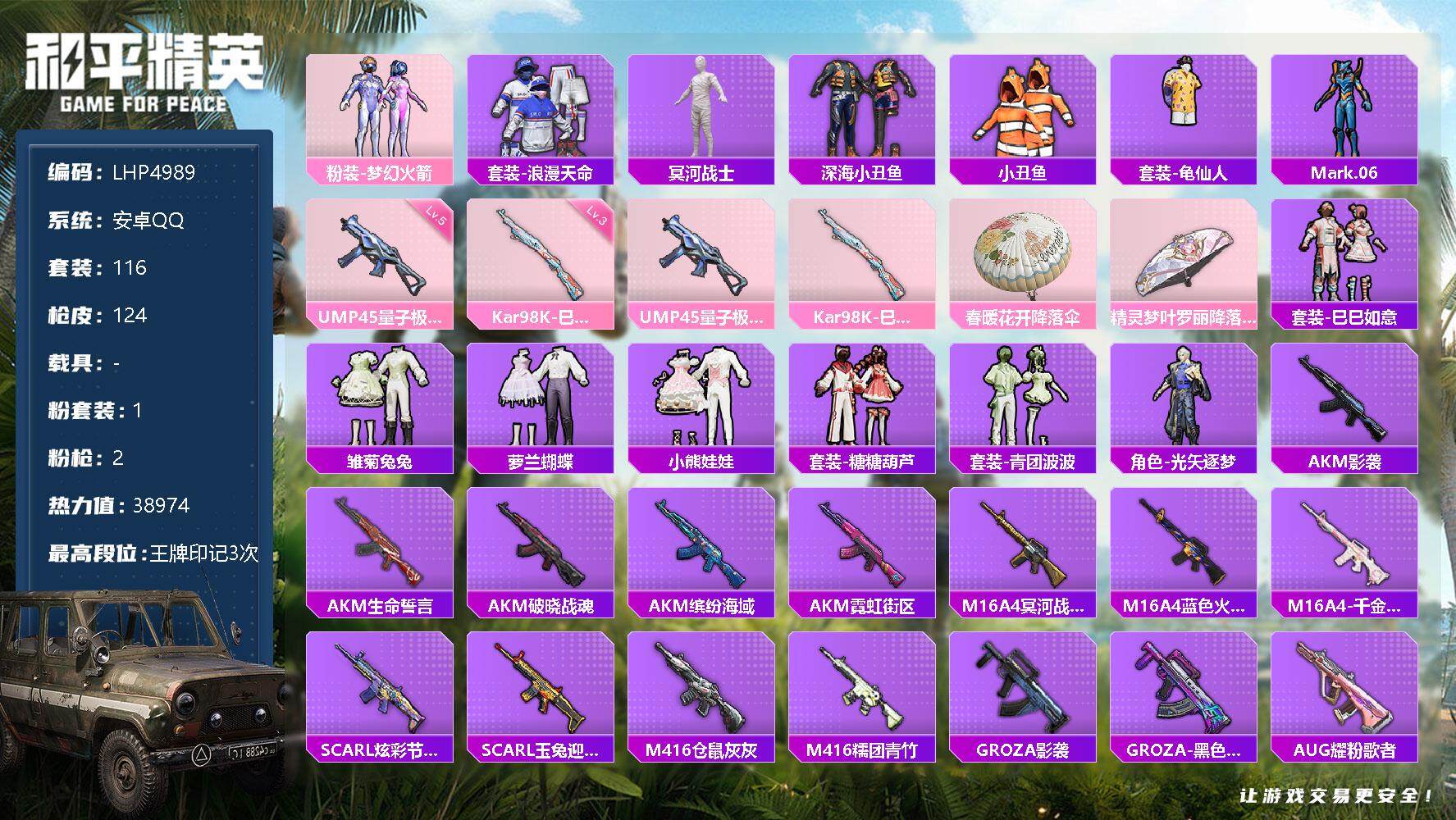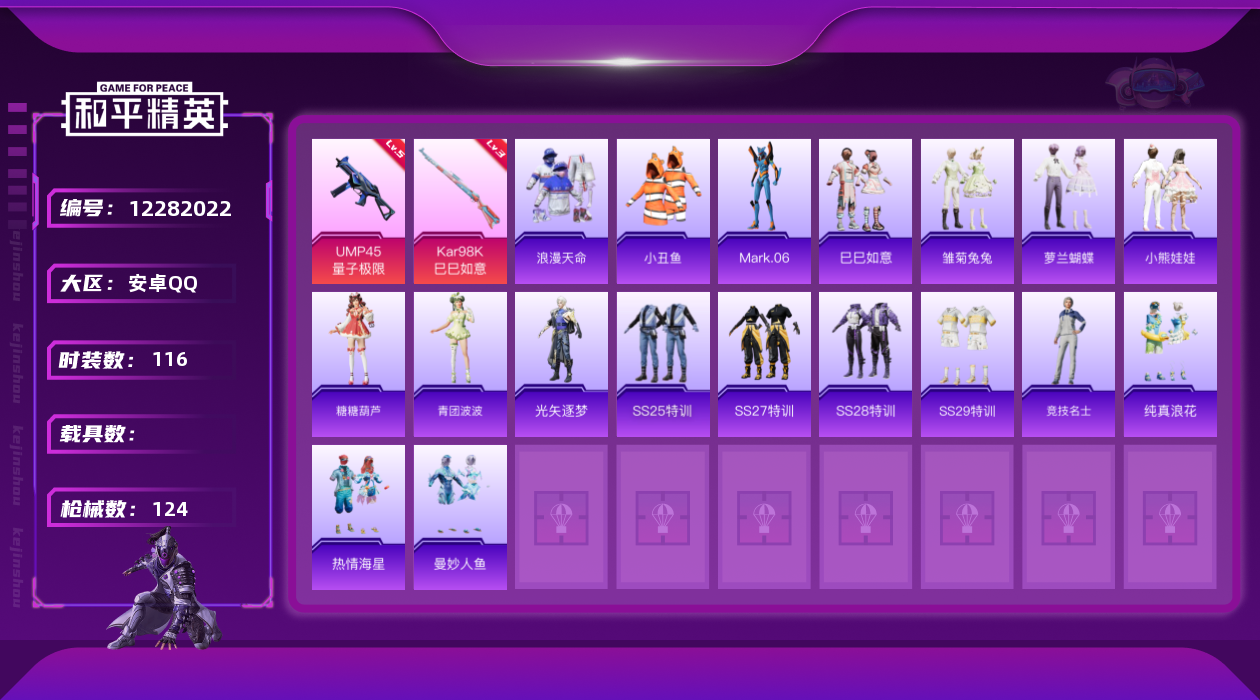 [12282022]老木乃伊【特价急出/详情看图】:安卓 手Q-1粉装-2特效枪-3.8w热力值-3王牌印记-116套装-124枪皮【热门品类】:粉装-梦幻火箭,套装-浪漫天命,套装-冥河战士,套装-深海小丑鱼,套装-小丑鱼,套装-龟仙人,角色-Mark.06【粉色套装】:粉装-梦幻火箭【粉色枪皮等级】:UMP45-量子极限(五级),Kar98K-巳巳如意(三级)