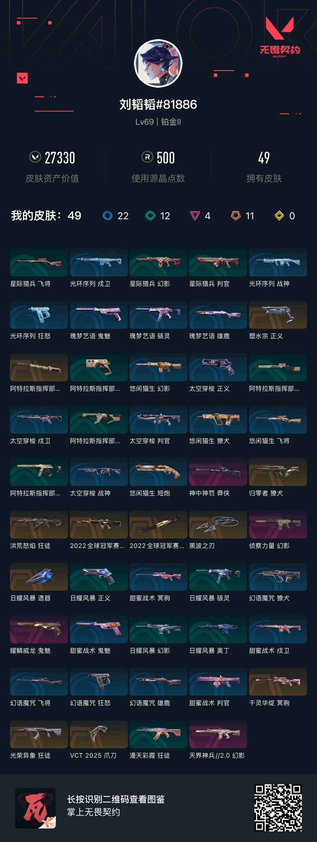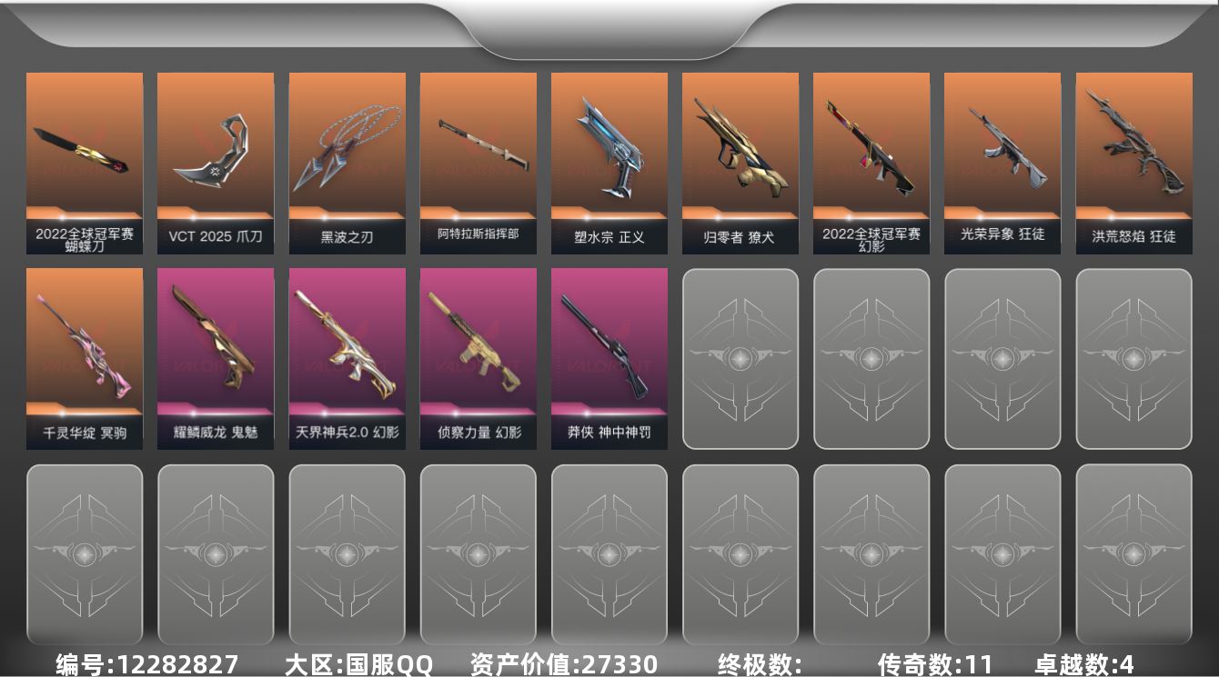 [12282827]11橙皮 4紫皮 49皮肤 18英雄 53卡面 500已用源晶 铂金 优质装备:冥驹-千灵华绽,幻影-侦察力量,獠犬-归零者,正义-塑水宗,狂徒-洪荒怒焰,幻影-天界神兵2.0,黑波之刃,VCT 2025 爪刀,阿特拉斯指挥部,鬼魅-耀鳞威龙 亮点皮肤:幻影-2022全球冠军赛,2022全球冠军赛 蝴蝶刀 套装:2022全球冠军赛,VCT 2025赛季礼包,VCTCN2025套装 步枪皮肤:狂徒-光荣异象 狙击枪皮肤:莽侠-神中神罚