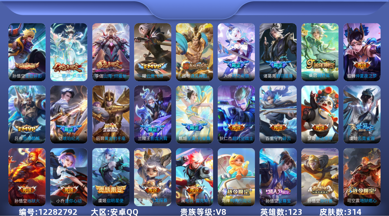 - [11598693]实名: 可修改 贵族等级: V5 英雄数: 123 皮肤数: 187 传说皮: 猫影幻舞 限定皮: 遇见飞天,李小龙,梁祝,冰霜恋舞曲,如梦令-后羿,猪悟能,五谷丰年,鸣野蒿