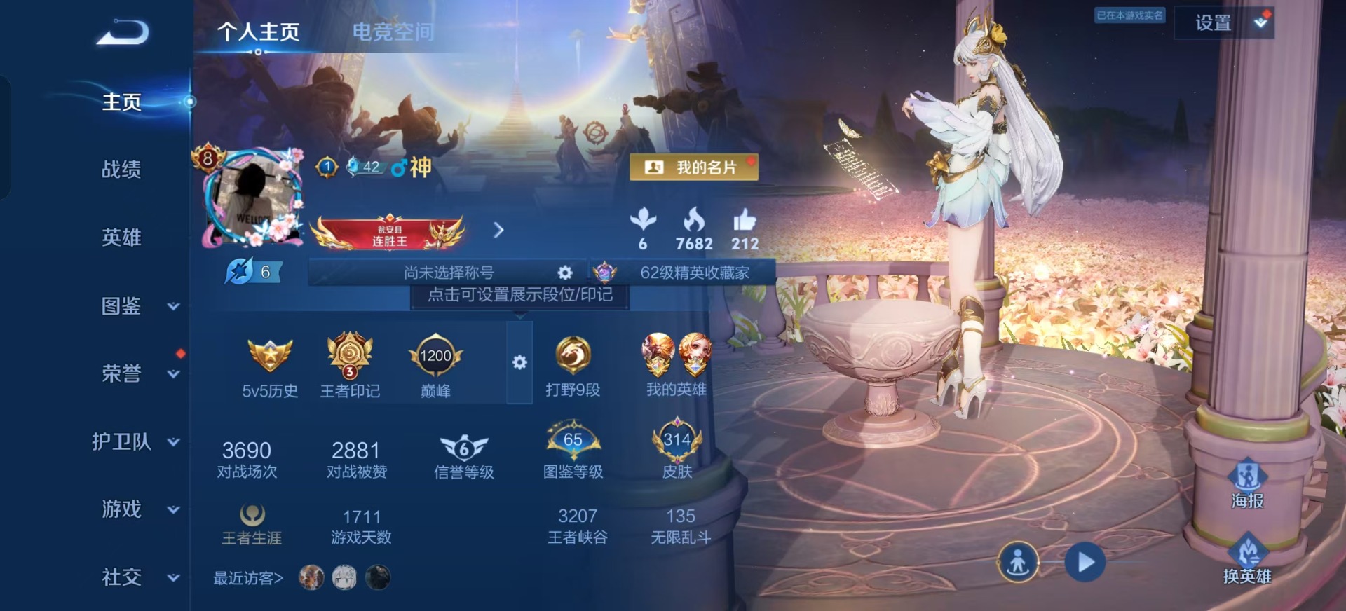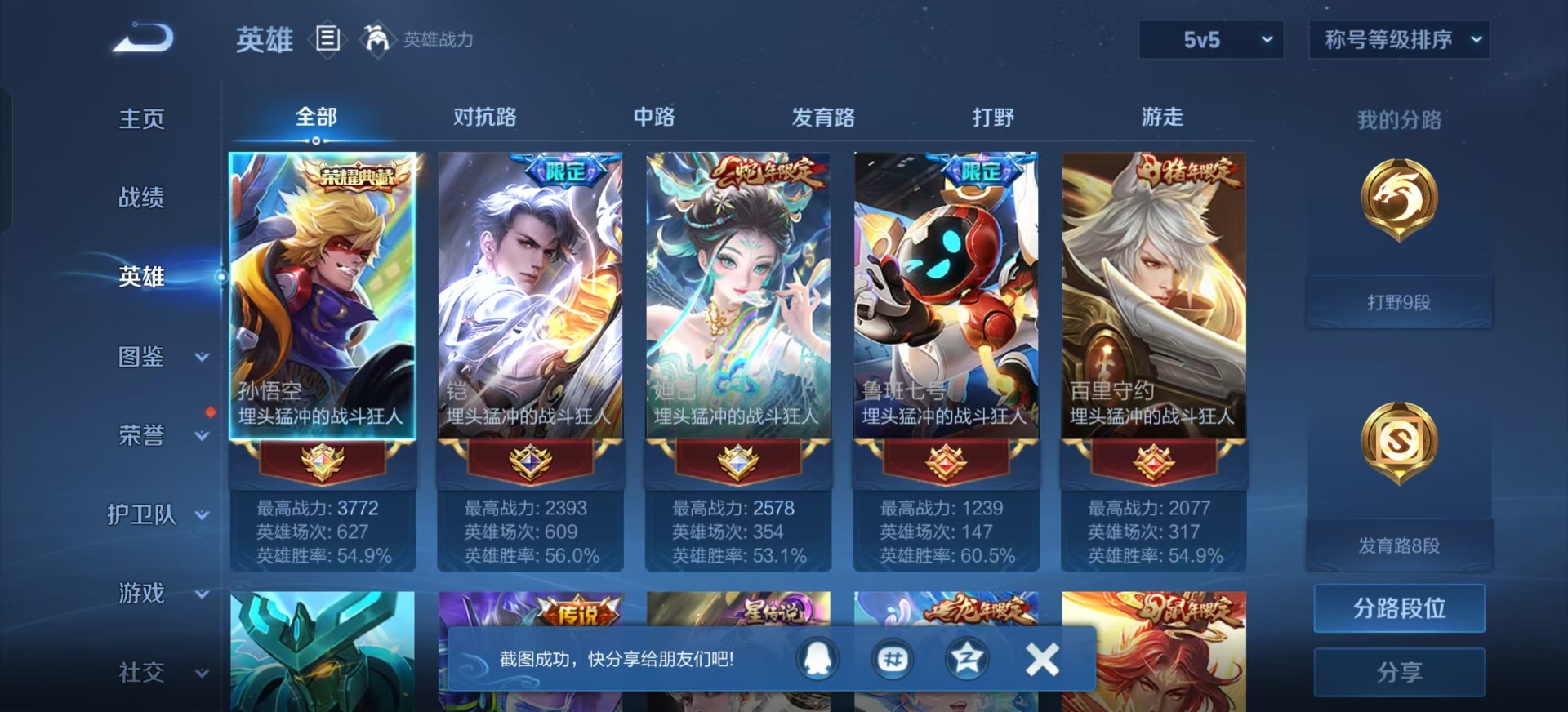 - PX_2093007-贵族等级: V6 英雄数: 123 皮肤数: 177 星传说: 金色仲夏夜 传说皮: 仲夏夜之梦 限定皮: 李小龙,梁祝,时雨天司,高山流水,五谷丰年