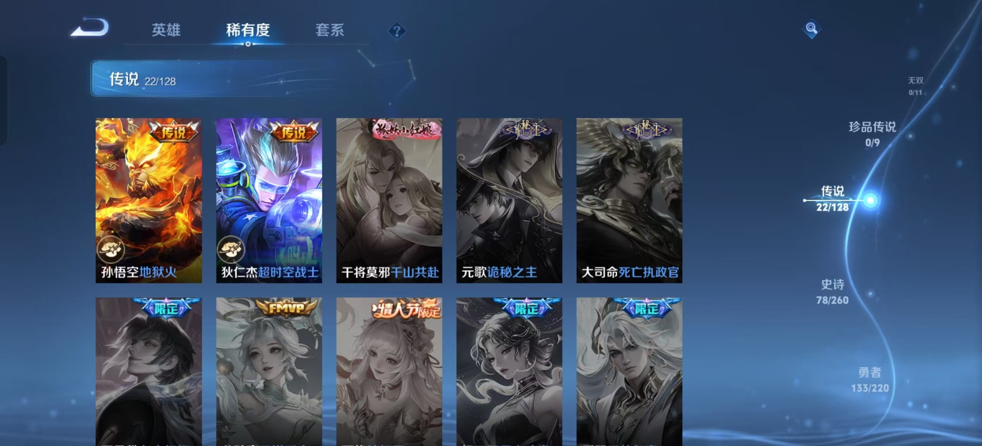 甄姬至美·化雀舞,铠青龙志,赵云龙胆,鲁班七号乒乒小将,后羿辉光之辰,兰陵王影龙天霄,上官婉儿神器·万象笔,马可波罗山海·玄木吟,西施至美·乘鲤谣,桑启鸣野蒿,孙悟空孙行者,孙悟空至尊宝,妲己时之奇旅,妲己愿照·众生和,韩信飞衡,百里守约朱雀志