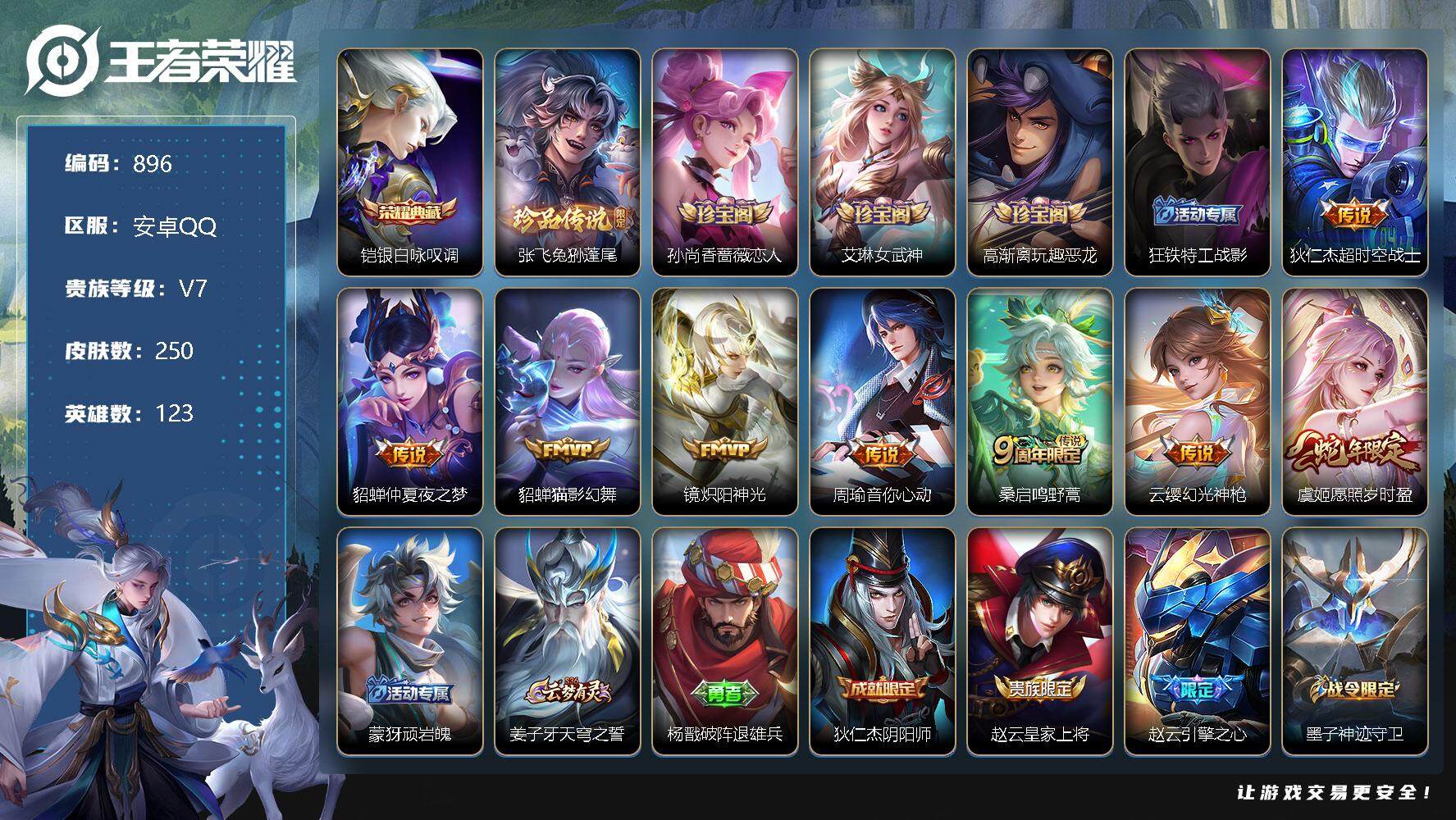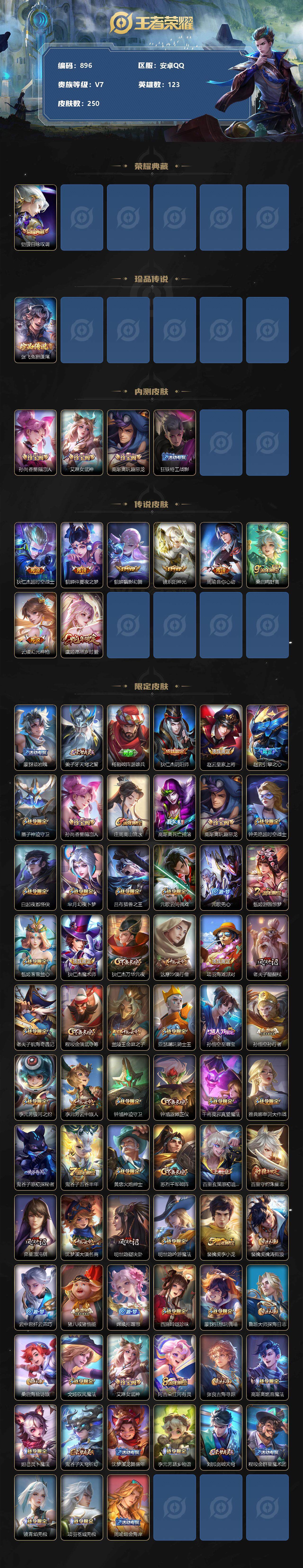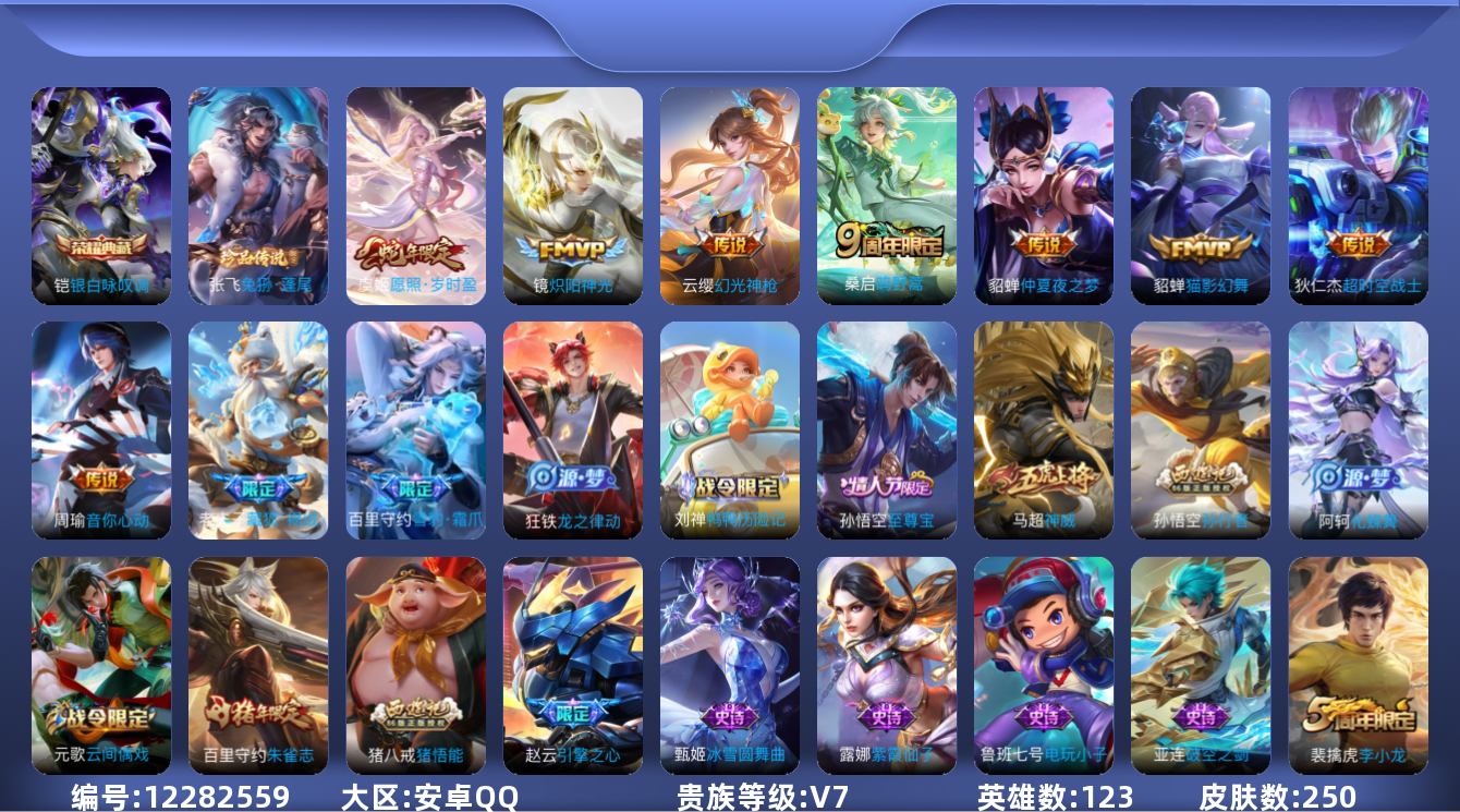 [12282559]【商品标题】:安卓Q-V7-最强王者段位-123英雄-250皮肤-1典藏-0珍品无双-0无双-1珍品传说-8传说-79史诗