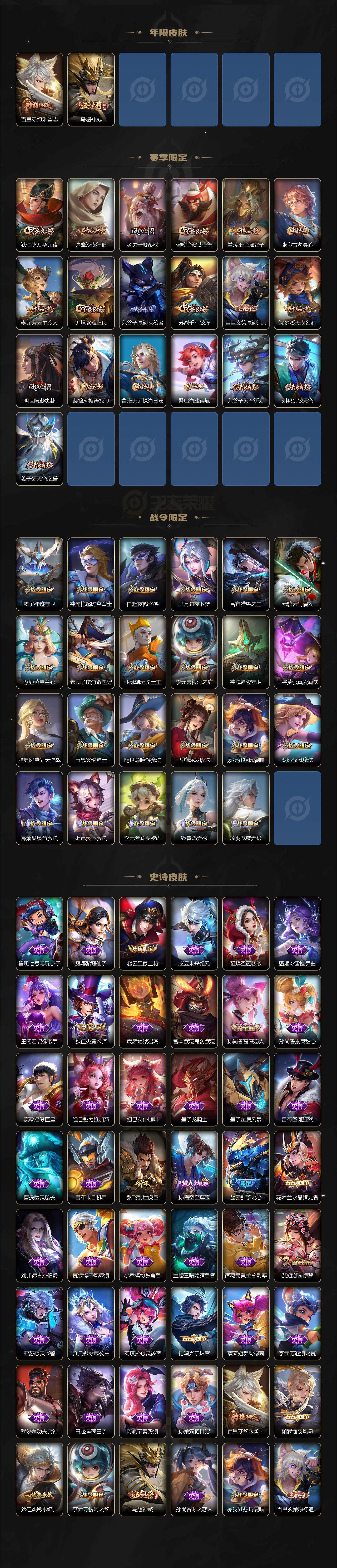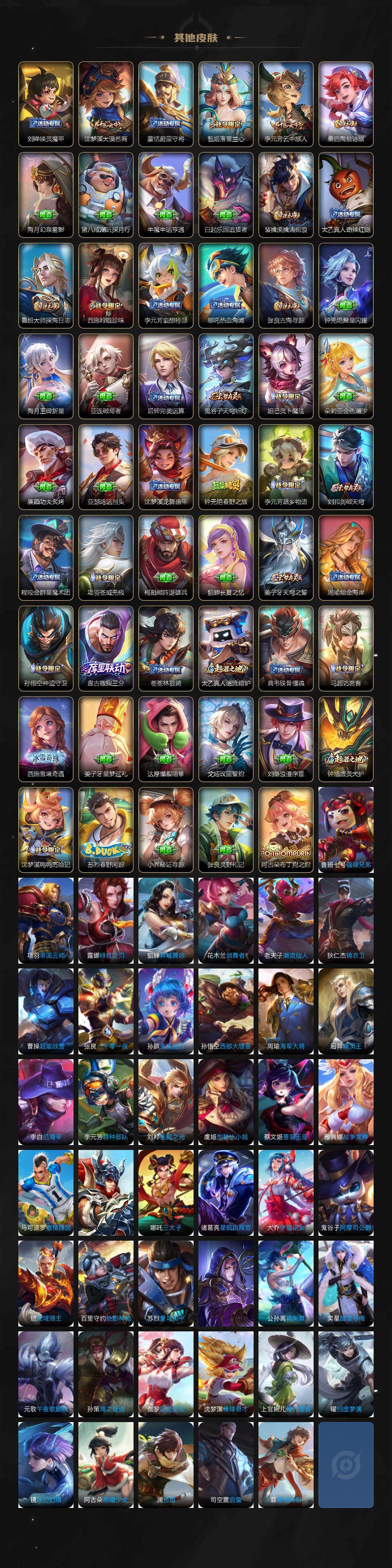 【赛季限定】:狄仁杰万华元夜,达摩沙漠行僧,老夫子醍醐杖,程咬金演武夺筹,兰陵王金庭之子,张良古海寻踪,李元芳云中旅人,钟馗驱傩正仪,鬼谷子原初探秘者,苏烈千军破阵,百里玄策原初追逐者,弈星混沌棋,沈梦溪大漠名商,明世隐疑决卦,裴擒虎擒涛扼浪,鲁班大师探海日志,桑启海盐诗旅,鬼谷子天穹祈灯,刘邦剑破天穹,姜子牙天穹之誓