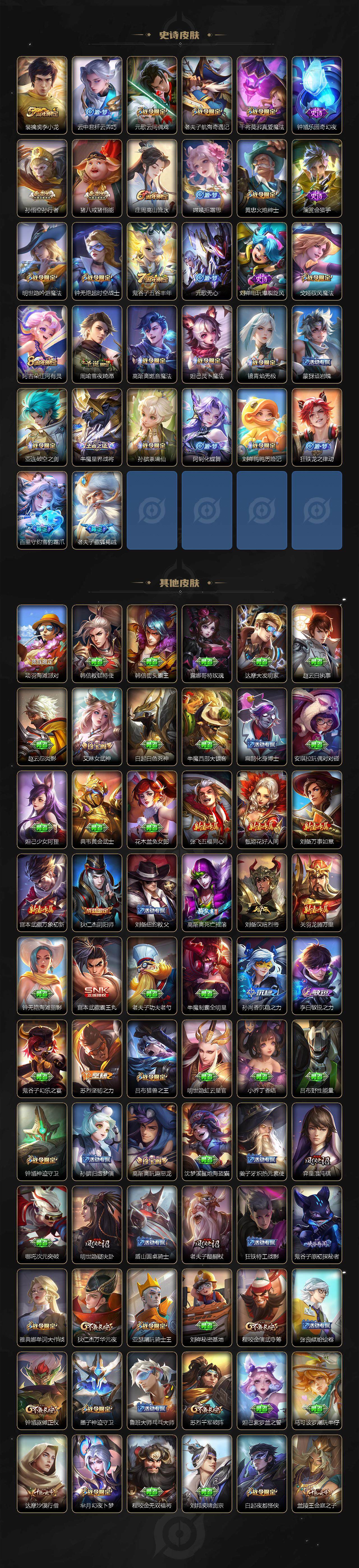 【限定皮肤】:蒙犽顽岩魄,姜子牙天穹之誓,杨戬破阵退雄兵,狄仁杰阴阳师,赵云皇家上将,赵云引擎之心,墨子神迹守卫,孙尚香蔷薇恋人,庄周高山流水,高渐离死亡摇滚,高渐离玩趣恶龙,钟无艳超时空战士,白起夜都怪侠,芈月幻夜卜梦,吕布猎兽之王,元歌云间偶戏,元歌无心,甄姬游园惊梦,甄姬落雪兰心,狄仁杰魔术师,狄仁杰万华元夜,达摩沙漠行僧,项羽海滩派对,老夫子醍醐杖,老夫子航海奇遇记,程咬金演武夺筹,兰陵王金庭之子,亚瑟潮玩骑士王,孙悟空至尊宝,孙悟空孙行者,李元芳银河之约,李元芳云中旅人,钟馗神迹守卫,钟馗驱傩正仪,干将莫邪真爱魔法,雅典娜单词大作战,鬼谷子原初探秘者,鬼谷子五谷丰年,黄忠火炮绅士,苏烈千军破阵,百里玄策原初追逐者,百里守约朱雀志,弈星混沌棋,沈梦溪大漠名商,明世隐疑决卦,明世隐吟游魔法,裴擒虎李小龙,裴擒虎擒涛扼浪,云中君纤云弄巧,猪八戒猪悟能,嫦娥拒霜思,西施玲珑珍味,蒙犽狂想玩偶喵,鲁班大师探海日志,桑启海盐诗旅,戈娅驭风魔法,艾琳女武神,阿古朵江河有灵,张良古海寻踪,高渐离燃音魔法,妲己灵卜魔法,鬼谷子天穹祈灯,沈梦溪龙舞盛年,李元芳蔬乡物语,刘邦剑破天穹,程咬金群星魔术团,镜青焰无极,项羽苍威无极,周瑜熔金海岸