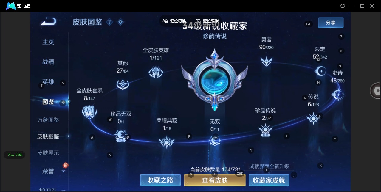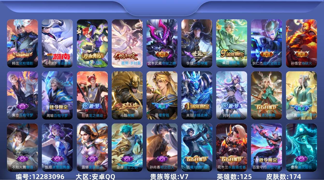 [12283096]V7 1典藏 2珍品传说 6传说 125英雄 174皮肤 可修改实名 优质装备:弑枪猎影(韩信典藏),怪盗基德,一念神魔,地狱火,地狱之眼,超时空战士-狄仁杰 珍品传说:时之奇旅-孙策 珍宝阁皮:玩趣恶龙 限定皮:愿照·岁时盈(虞姬年限),逐霄战戟,鸣野蒿,神威(电光马子),冰锋战神 史诗皮:器灵·浮梦炉,化蝶舞,星界战将,龙之律动,百相守梦-周瑜,茶境仙,破空之剑,蒙犽顽岩魄,埋骨钱,百相守梦-百里守约,百相守梦-黄忠,遇见神鹿,紫霞仙子,特工魅影,千年之狐,魅语,冰冠公主,偶像歌手,末日机甲-吕布,时之恋人-孙尚香,乱世虎臣,摇滚巨星,水果甜心,星夜王子,心灵骇客,暗隐猎兽者,幽灵船长,鬼剑武藏,地狱岩魂,乘风破浪,逐浪之夏,水晶猎龙者,曙光守护者,箭羽风息,金属风暴,原初追逐者,圣诞狂欢,鹰眼统帅,暗夜贵公子,魅力维加斯,未来纪元-赵云