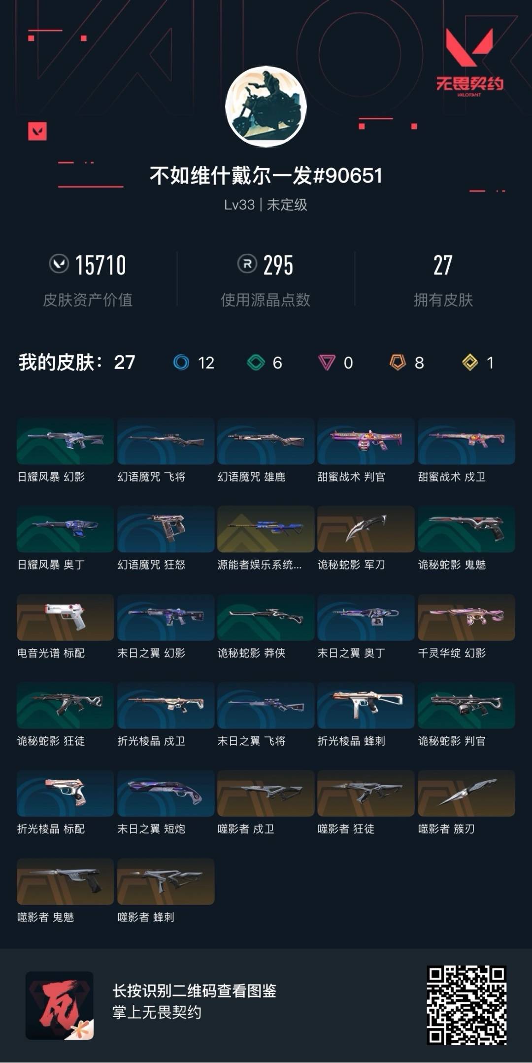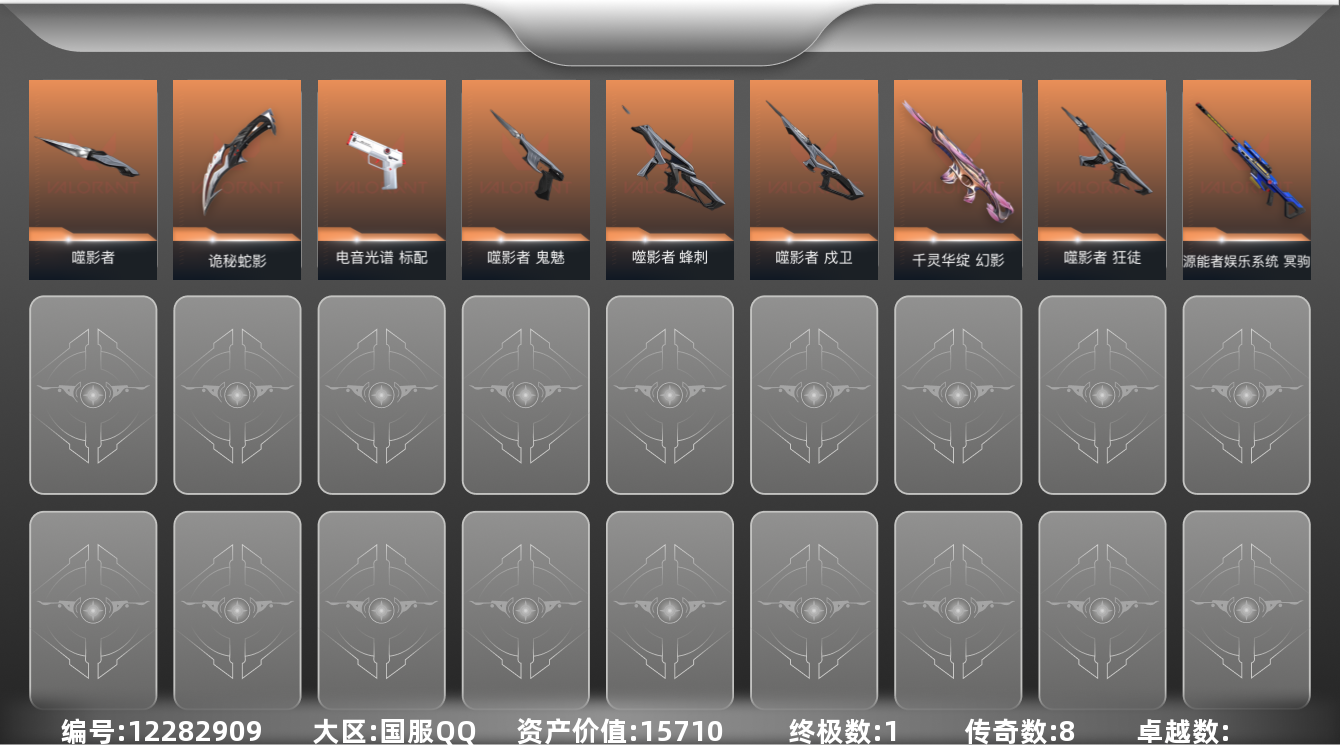 [12282909]8橙皮 1金皮 27皮肤 14英雄 31卡面 295已用源晶 未定级 优质装备:幻影-千灵华绽,冥驹-源能者娱乐系统,噬影者簇刃,诡秘蛇影 套装:噬影者 佩枪皮肤:标配-电音光谱,鬼魅-噬影者 冲锋枪皮肤:蜂刺-噬影者 步枪皮肤:戍卫-噬影者,狂徒-噬影者