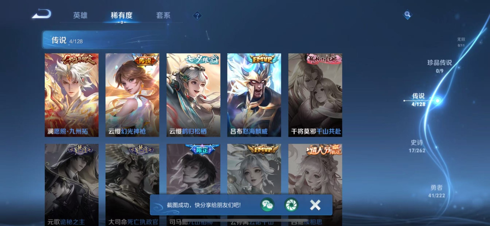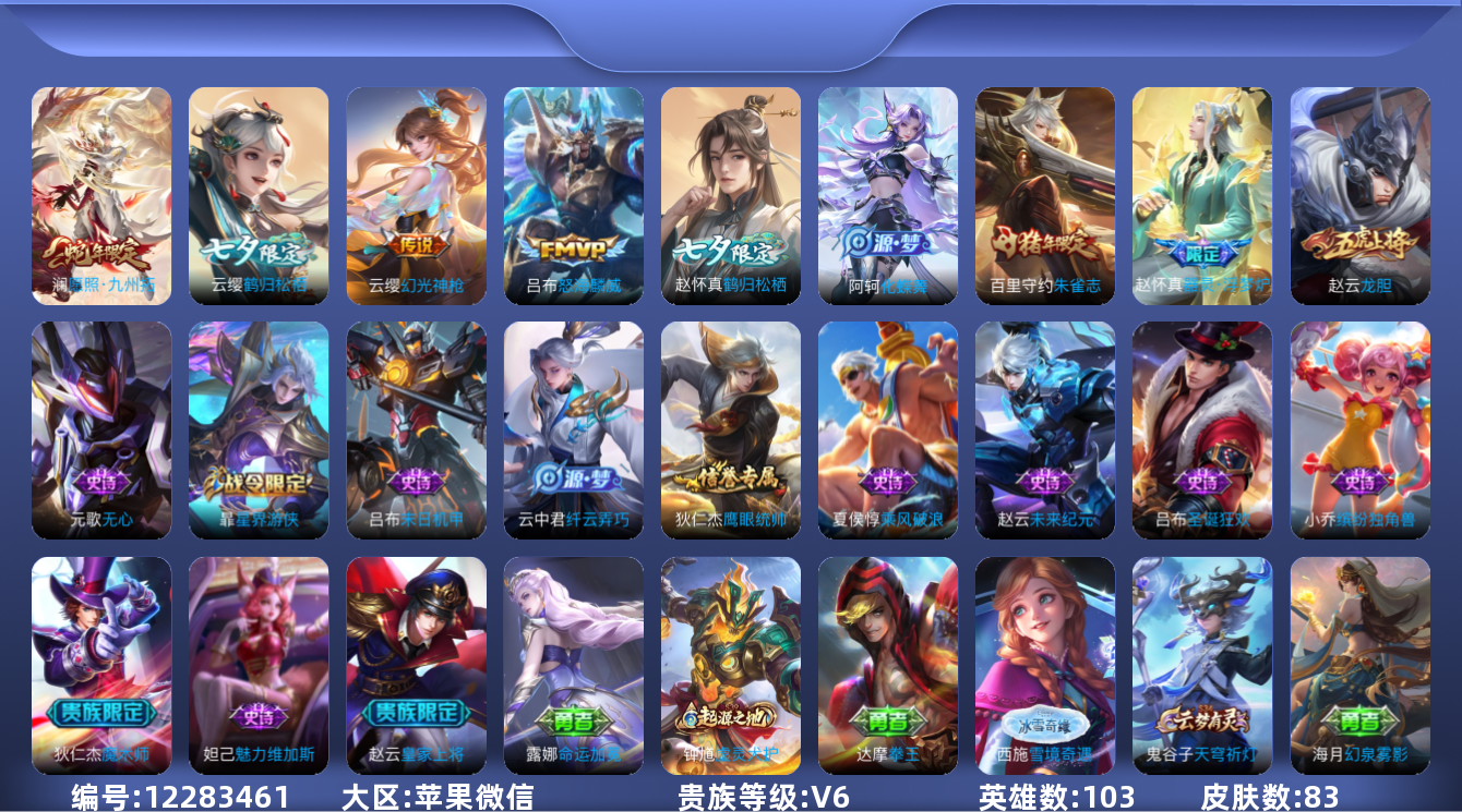 [12283461]V6 4传说 103英雄 83皮肤 可修改实名 所有社交场景限制 优质装备:鹤归松栖(云缨) 传说皮:幻光神枪 限定皮:愿照·九州拓(澜年限),怒海麟威,龙胆,朱雀志(守约年限) 史诗皮:器灵·浮梦炉,化蝶舞,鹤归松栖(赵怀真),末日机甲-吕布,纤云弄巧,缤纷独角兽,乘风破浪,圣诞狂欢,鹰眼统帅,魅力维加斯,无心,未来纪元-赵云