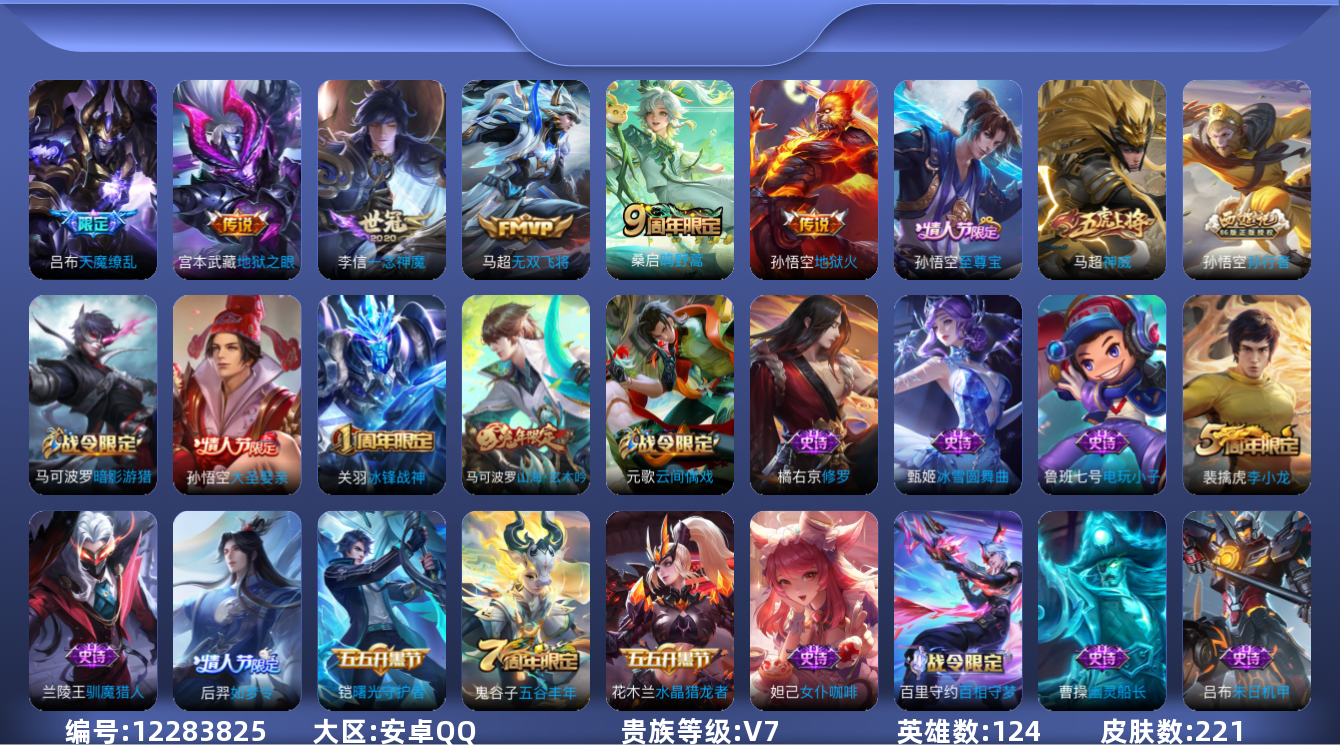 - [11884869]V9 3典藏 1无双 28传说 125英雄 390皮肤 可修改实名 优质装备:鸣剑·曳影,全息碎影(猴子典藏),碎月剑心(李白无双),最初的交响(伽罗典藏),黄金狮子座,黄金射手座,炽阳神光,一念神魔,仲夏夜之梦(大飞蛾),零号·赤焰,李逍遥,时之恋人-刘备(电焊工),游龙清影(小青龙),超时空战士-狄仁杰,末日机甲-孙策,挚爱之约,惊梅引,遇见神鼓,夜礼服假面,霜月吟 珍宝阁皮:女武神,玩趣恶龙 限定皮:鸣野蒿,至尊宝,白虎志(电光耗子),凤求凰(白切鸡),武陵仙君(小桃花),异界灵契(白毛香),傲雪梅枪,白鹤梁神女,时雨天司(水龙头),神威(电光马子),飞衡(韩信年限),遇见飞天,高山流水,诗剑行,五谷丰年,冰锋战神,幽恒(沐浴露),武圣,游园惊梦,梁祝,逐梦之星,天狼溯光者,李小龙,逐梦之影,朱雀志(守约年限),辉光之辰,如梦令-嫦娥,如梦令-后羿,默契交锋-花木兰,真爱至上,孙行者,猪悟能,一生所爱,大圣娶亲,冰霜恋舞曲,蜜橘之夏,美猴王,寅虎·御盾(廉颇年限),寅虎·心曲(虎婆),寅虎·赤拳(老虎年限),百木心枪,玉兔公主,启示之音,深海之息(深海大菠萝) 史诗皮:鸭鸭历险记-刘禅,灵蛊蚀心,星界战将,龙之律动,藏狐·褐绒,小牛鸭,石田雨龙,破空之剑,百相守梦-黄忠,紫霞仙子,电玩小子(小书包),黄金分割率,特工魅影,千年之狐,永昼,江河有灵,匿光侦查者,魅语,百解令(蒙犽),高渐离燃音魔法,蒙恬荣光圣徽,无限星赏官,冰冠公主,青蛇,偶像歌手,白蛇,晚萤,暗夜猫娘,龙骑士(小龙虾),末日机甲-吕布,猫狗日记-孙策,猫狗日记-大乔,时之恋人-孙尚香,乱世虎臣,节奏热浪,修罗,女仆咖啡,摇滚巨星,水果甜心,绅士熊喵,天才门将,星夜王子,心灵骇客,时之奇旅-安琪拉,功夫厨神,德古拉伯爵,暗隐猎兽者,幽灵船长,鬼剑武藏,心灵战警,乐园奇幻夜,舞动绿茵,地狱岩魂,纤云弄巧,繁星吟游(呼啦呼啦),拒霜思,缤纷独角兽,乘风破浪,逐浪之夏,龙鼓争鸣,水晶猎龙者,曙光守护者,箭羽风息,金属风暴,原初追逐者,圣诞狂欢,圣诞恋歌,鹰眼统帅,暗夜贵公子,魅力维加斯,黎明之约,赏金猎手,奇遇舞章,寅虎·御盾,未来纪元-赵云