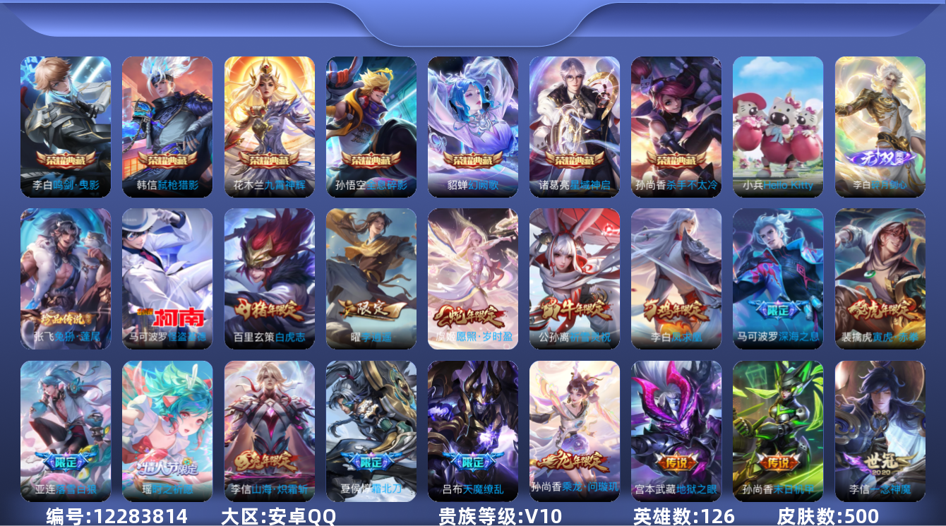 [12283814]V10 7典藏 1无双 2珍品传说 52传说 126英雄 500皮肤 典藏英雄武则天 可修改实名 优质装备:杀手不太冷,鸣剑·曳影,全息碎影(猴子典藏),星域神启(倪克斯贼亮),九霄神辉(木兰典藏),幻阙歌(貂蝉典藏),弑枪猎影(韩信典藏),碎月剑心(李白无双),Hello Kitty,怪盗基德,黄金射手座,冠军飞将,绛天战甲(鸡嘴战神),猫影幻舞,久胜战神,一念神魔,云霓雀翎,末日机甲-孙尚香(绿蚂蚱),地狱火,仲夏夜之梦(大飞蛾),零号·赤焰,海洋之心,地狱之眼,飞鸢探春,胖达荣荣,李逍遥,时之恋人-刘备(电焊工),游龙清影(小青龙),淬星耀世,超时空战士-狄仁杰,末日机甲-孙策,挚爱之约,挚爱花嫁,无双飞将,山海·炽霜斩(李信年限),炽翼辉光(娃娃菜牛角包),百相守梦(张飞),鹤羽星尊,艾琳觅芳踪,黄金天蝎座,涂山容容 珍品传说:兔狲·蓬尾 传说皮:乘龙·问璇玑(孙尚香年限),落雪白狼,幻光神枪 珍宝阁皮:妄想食味,优雅恋人,蔷薇恋人,女武神 限定皮:愿照·岁时盈(虞姬年限),鸣野蒿,夏侯惇霜北刀,至尊宝,白虎志(电光耗子),凤求凰(白切鸡),傲雪梅枪,补天,前尘镜,星穹之声,魔法小厨娘,飞衡(韩信年限),遇见飞天,高山流水,诗剑行,匿光决锋者,降魔,五谷丰年,冰锋战神,幽恒(沐浴露),武圣,游园惊梦,梁祝,逐梦之翼,逐梦之星,岱宗(典韦年限),天狼溯光者,祈雪灵祝(雪兔子),李小龙,玄武志(苏烈年限),朱雀志(守约年限),如梦令-嫦娥,圣诞老人,奇迹圣诞,真爱至上,纯白花嫁,猪悟能,大圣娶亲,天魔缭乱,青春决赛季,冰霜恋舞曲,热情桑巴,美猴王,匿光追影者,寅虎·瑞焰(虎皮蛋子),寅虎·赤拳(老虎年限),时之祈愿-瑶(瑶传限),百木心枪,启示之音,无尽星芒,深海之息(深海大菠萝),天降福星 史诗皮:鸭鸭历险记-刘禅,器灵·浮梦炉,狼魂孤将,化蝶舞,灵蛊蚀心,星界战将,谪仙醉月,龙之律动,雪豹·霜爪,藏狐·褐绒,石田雨龙,百相守梦-周瑜,戍鼓铭心,茶境仙,怒海争锋,炽弈燎原,东方月初,埋骨钱,芈月浮光幕影,海诺心动手记,琥珀纪元伽罗,决胜骁骑,上官婉儿群星魔术团,蔬乡物语(鲁班七号),百相守梦-百里守约,百相守梦-黄忠,紫霞仙子,苍穹之光,电玩小子(小书包),白龙吟,黄金分割率,特工魅影,千年之狐,永昼,末日机甲-莱西奥,雪夜绮愿(周瑜),魅语,百解令(蒙