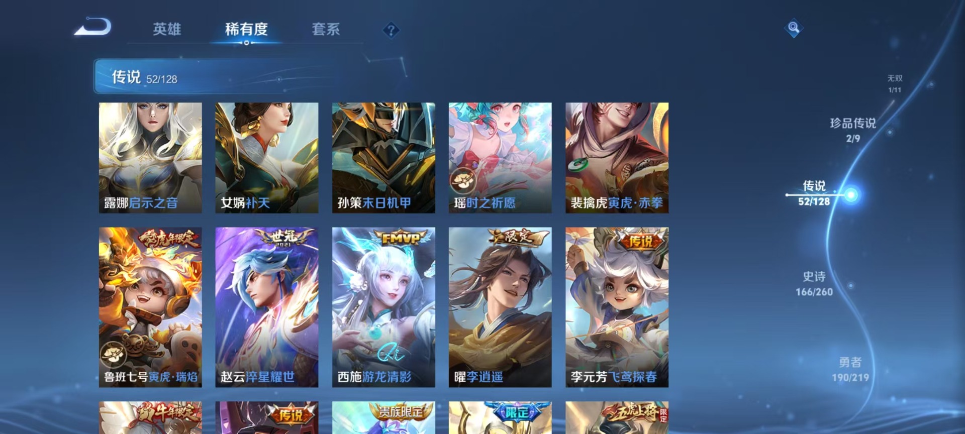 夏侯惇匿光决锋者,夏侯惇霜北刀,老夫子圣诞老人,哪吒逐梦之翼,甄姬幽恒,伽罗天狼溯光者,苏烈玄武志,赵云百木心枪,干将莫邪冰霜恋舞曲,小乔纯白花嫁,典韦岱宗,鲁班七号寅虎·瑞焰,后羿无尽星芒,露娜启示之音,镜匿光追影者,周瑜真爱至上,公孙离祈雪灵祝,裴擒虎李小龙,裴擒虎寅虎·赤拳,上官婉儿梁祝,李白诗剑行,花木兰青春决赛季,安琪拉魔法小厨娘,马可波罗逐梦之星,马可波罗深海之息,桑启鸣野蒿,猪八戒猪悟能,女娲补天,孙悟空大圣娶亲,孙悟空至尊宝,孙悟空美猴王,百里玄策白虎志,韩信傲雪梅枪,韩信飞衡,百里守约朱雀志,蔡文姬奇迹圣诞,墨子降魔,瑶时之祈愿,虞姬愿照·岁时盈,娜可露露前尘镜,妲己热情桑巴,嫦娥如梦令,王昭君星穹之声,关羽武圣,关羽冰锋战神