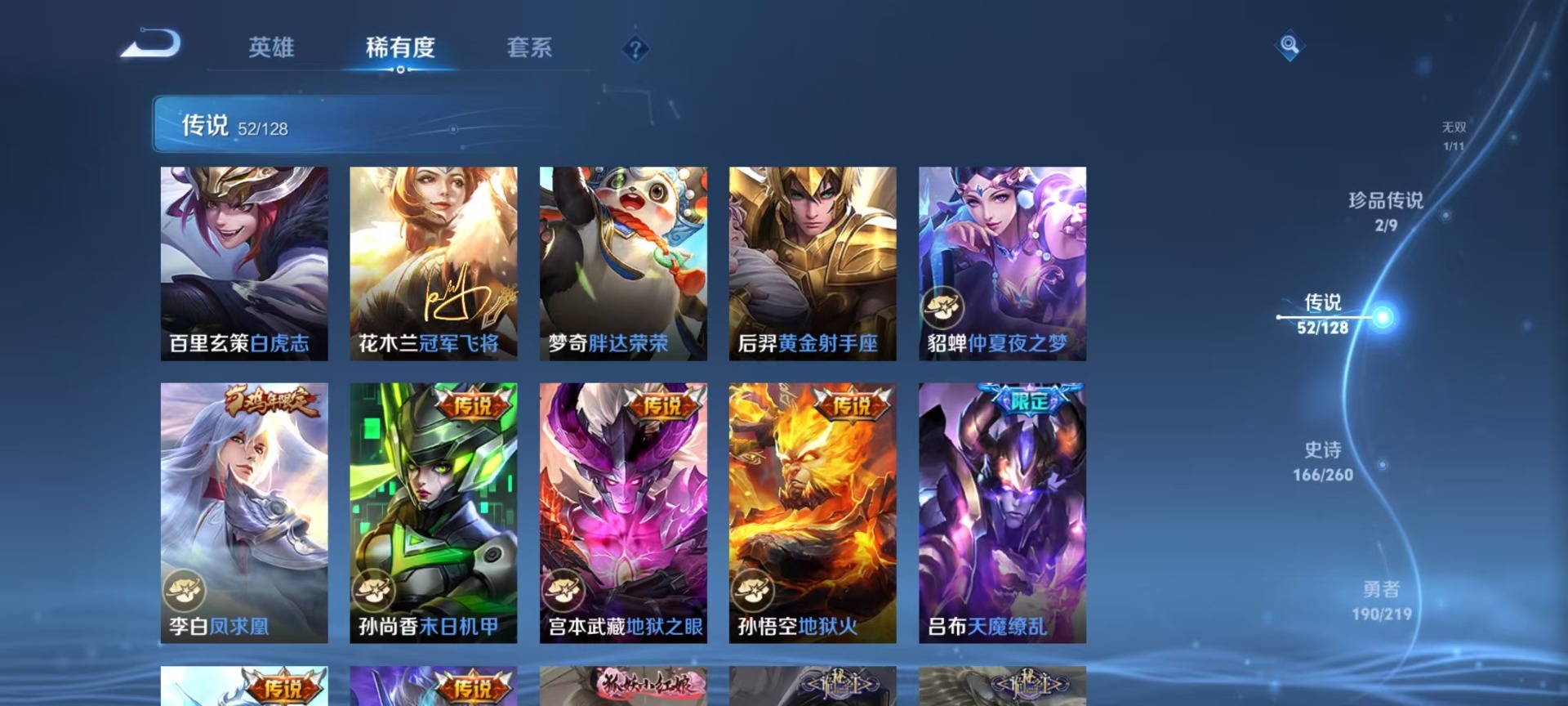 夏侯惇朔风刀,老夫子醍醐杖,沈梦溪大漠名商,盾山御銮,曹操烛龙,孙膑妖精王,苏烈千军破阵,典韦穷奇,典韦蓝屏警告,达摩沙漠行僧,牛魔御旌,项羽苍威无极,鲁班七号狮舞东方,吕布猎兽之王,镜青焰无极,庄周蜃楼王,元歌云间偶戏,兰陵王金庭之子,裴擒虎擒涛扼浪,鲁班大师探海日志,明世隐疑决卦,蒙犽狂想玩偶喵,马可波罗暗影游猎,白起狰,鬼谷子原初探秘者,张良古海寻踪,桑启海盐诗旅,狄仁杰万华元夜,嬴政白昼王子,芈月重明,程咬金演武夺筹,扁鹊炼金王,李元芳银河之约,李元芳云中旅人,弈星混沌棋,虞姬凯尔特女王,米莱狄御霄,钟馗神迹守卫,钟馗驱傩正仪,狂铁御狮,太乙真人饕餮