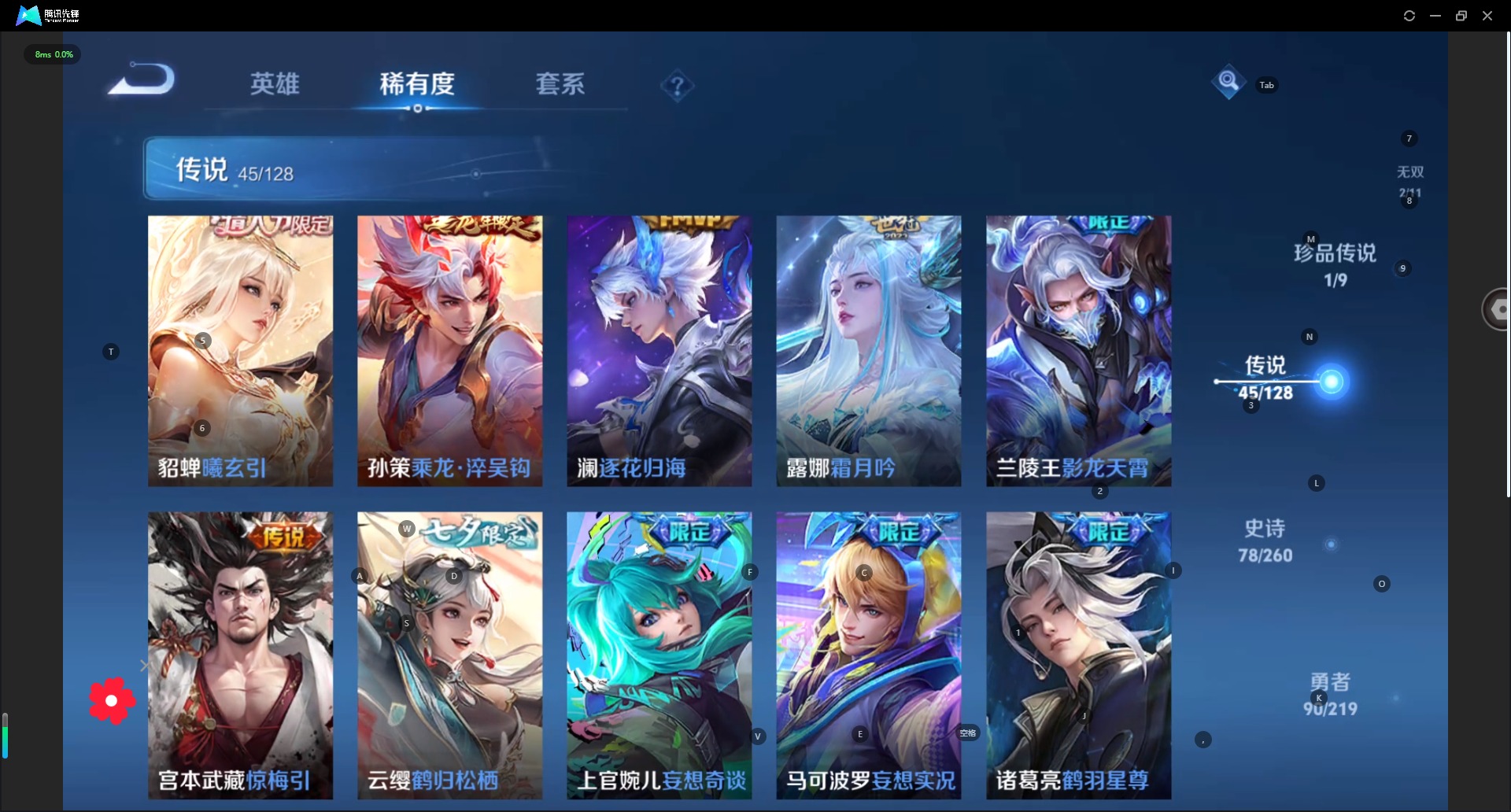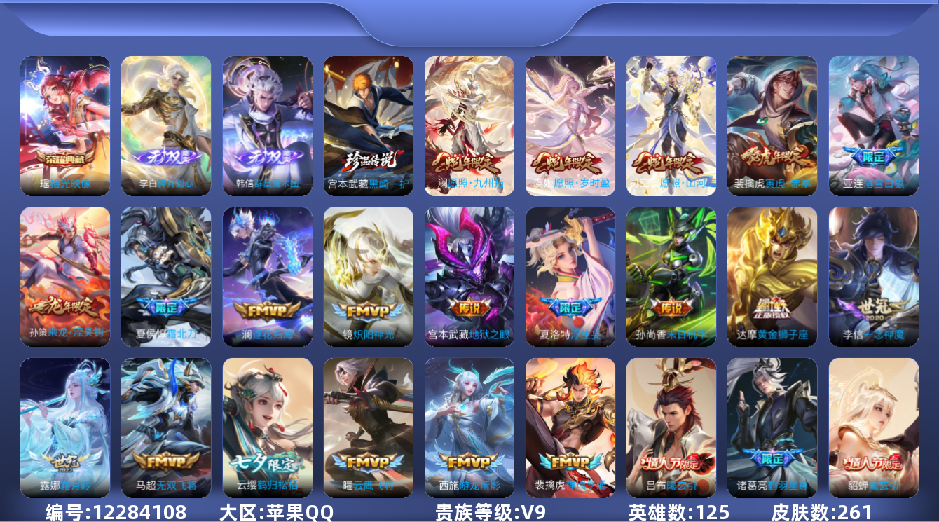 [12284108]V9 1典藏 2无双 1珍品传说 45传说 125英雄 261皮肤 可修改实名 优质装备:碎月剑心(李白无双),韩信群星魔术团(韩信无双),拾光映像(瑶典藏),黑崎一护,黄金狮子座,黄金射手座,云鹰飞将(小将军),绛天战甲(鸡嘴战神),黄金白羊座,炽阳神光,一念神魔,末日机甲-孙尚香(绿蚂蚱),地狱火,仲夏夜之梦(大飞蛾),音你心动-小乔,零号·赤焰,地狱之眼,飞鸢探春,胖达荣荣,乞巧织情,游龙清影(小青龙),超时空战士-狄仁杰,无双飞将,碎云,画中仙,浮生妄,鹤羽星尊,妄想实况,妄想奇谈,鹤归松栖(云缨),惊梅引,霜月吟,澜逐花归海,云中君群星魔术团,牧神诗旅 传说皮:乘龙·淬吴钩(孙策年限),貂蝉曦玄引,吕布曦玄引,落雪白狼,祥瑞亨通 珍宝阁皮:妄想食味 限定皮:愿照·九州拓(澜年限),愿照·岁时盈(虞姬年限),愿照·山河定(司空震年限),陌上桑,鸣野蒿,夏侯惇霜北刀,至尊宝,神威(电光马子),影龙天霄,怒海麟威,御风骁将(吕布年限),天狼狩猎者,烈魂,孙行者,引擎之心,乒乒小将,寅虎·赤拳(老虎年限) 史诗皮:苍鳞隐世,器灵·浮梦炉,糖绘人间,星界战将,撼地雄心,破空之剑,琥珀纪元伽罗,上官婉儿群星魔术团,蔬乡物语(鲁班七号),曹操夜都魔契,超元猎域,百相守梦-百里守约,紫霞仙子,电玩小子(小书包),黄金分割率,特工魅影,千年之狐,江河有灵,匿光侦查者,鹤归松栖(赵怀真),魅语,百解令(蒙犽),高渐离燃音魔法,蒙恬荣光圣徽,无限星赏官,冰冠公主,偶像歌手,白蛇,晚萤,末日机甲-吕布,乱世虎臣,节奏热浪,修罗,女仆咖啡,摇滚巨星,绅士熊喵,天才门将,星夜王子,功夫厨神,德古拉伯爵,暗隐猎兽者,幽灵船长,鬼剑武藏,暗渊魔法,乐园奇幻夜,天秀·启明,舞动绿茵,地狱岩魂,纤云弄巧,缤纷独角兽,乘风破浪,逐浪之夏,水晶猎龙者,曙光守护者,箭羽风息,金属风暴,鹰眼统帅,魅力维加斯,黎明之约,雪上飞焰,未来纪元-赵云