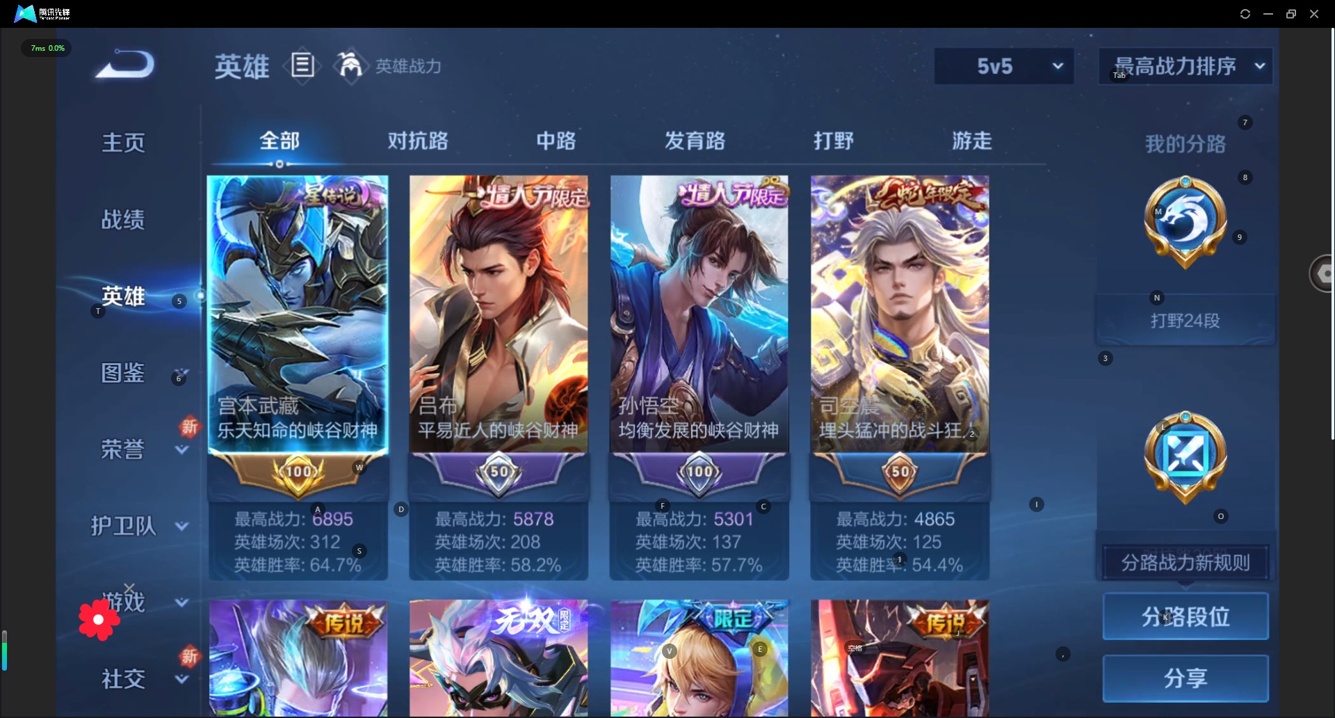 - [12075255]V5 1典藏 123英雄 119皮肤 可修改实名 优质装备:杀手不太冷,涂山容容 珍宝阁皮:蔷薇恋人 限定皮:五谷丰年,梁祝,李小龙,辉光之辰 史诗皮:化蝶舞,千年之狐,偶像歌手,猫狗日记-孙策,水果甜心,鬼剑武藏,圣诞狂欢,鹰眼统帅