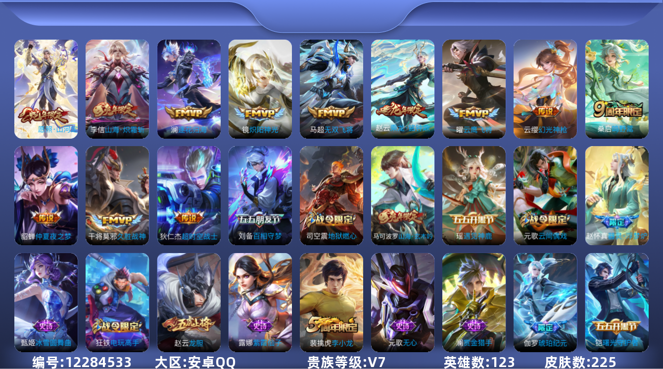 [12284533]【商品标题】:安卓Q-V3-永恒钻石II段位-123英雄-225皮肤-0典藏-0珍品无双-0无双-0珍品传说-12传说-52史诗