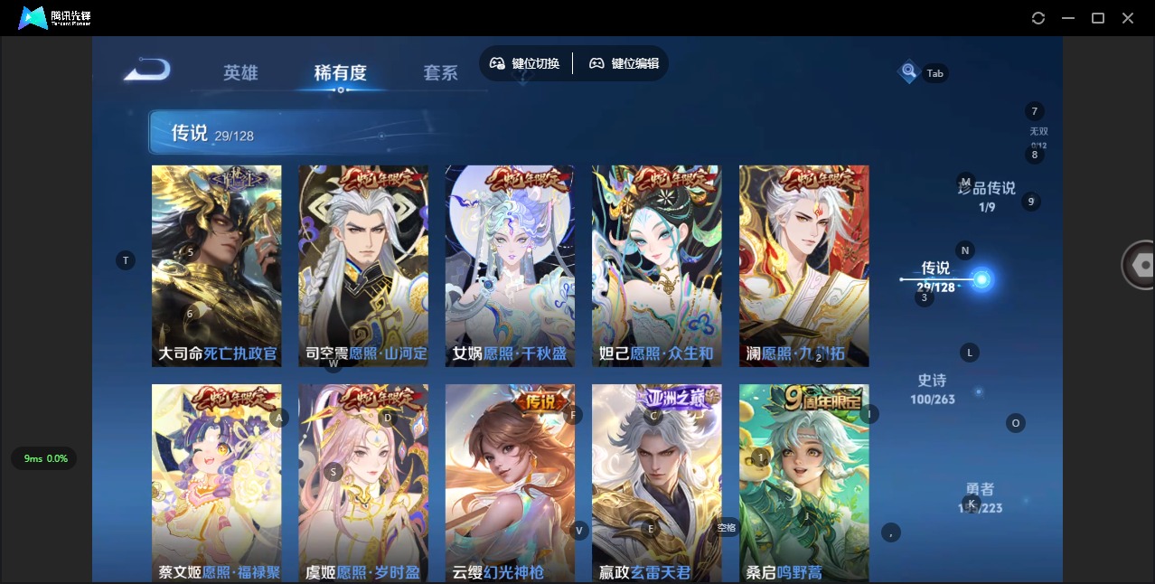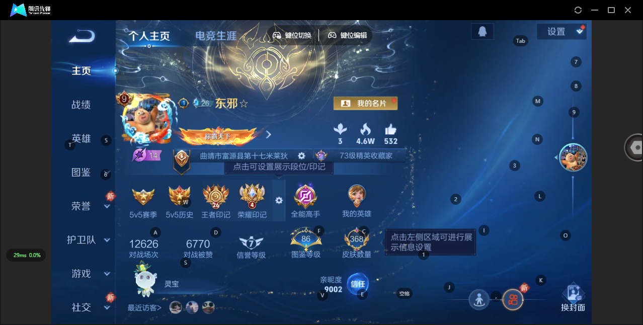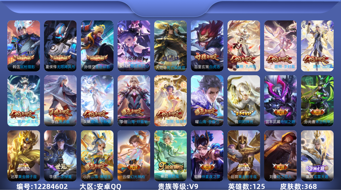[12284602]V9 3典藏 1珍品传说 29传说 125英雄 368皮肤 可修改实名 优质装备:无限飓风号(高达),全息碎影(猴子典藏),弑枪猎影(韩信典藏),酷洛米之心,黄金狮子座,黄金射手座,冠军飞将,黄金白羊座,炽阳神光,一念神魔,云霓雀翎,末日机甲-孙尚香(绿蚂蚱),仲夏夜之梦(大飞蛾),地狱之眼,时之恋人-刘备(电焊工),碎云,山海·炽霜斩(李信年限),山海·琳琅生(小乔年限),山海·苍雷引(电光曜子),炽翼辉光(娃娃菜牛角包),玄雷天君 传说皮:死亡执政官,幻光神枪 珍宝阁皮:万物之道,优雅恋人,女武神 限定皮:愿照·九州拓(澜年限),愿照·福禄聚(蔡文姬年限),愿照·岁时盈(虞姬年限),愿照·山河定(司空震年限),愿照·众生和(妲己年限),愿照·千秋盛(女娲年限),鸣野蒿,白虎志(电光耗子),凤求凰(白切鸡),傲雪梅枪,神威(电光马子),飞衡(韩信年限),山海·碧波行(瑶年限),遇见飞天,高山流水,五谷丰年,游园惊梦,梁祝,龙胆,烈魂,虎魄,天狼征服者,天狼绘梦者,逐梦之光,辉光之辰,如梦令-嫦娥,如梦令-后羿,一生所爱,大圣娶亲,冰霜恋舞曲,神奇女侠,山海·玄木吟(马可年限),冰霜神祇 史诗皮:鸭鸭历险记-刘禅,器灵·浮梦炉,绮世丹青,化蝶舞,龙之律动,星界战将,百相守梦-周瑜,茶境仙,百相守梦-黄忠,织梦人,电玩小子(小书包),白龙吟,特工魅影,千年之狐,永昼,冰冠公主,高渐离燃音魔法,蒙恬荣光圣徽,魅语,电玩·爆裂旋风,无限星赏官,晚萤,偶像歌手,龙骑士(小龙虾),末日机甲-吕布,猫狗日记-孙策,时之恋人-孙尚香,乱世虎臣,节奏热浪,修罗,女仆咖啡,摇滚巨星,水果甜心,绅士熊喵,天才门将,星夜王子,功夫厨神,德古拉伯爵,暗隐猎兽者,幽灵船长,鬼剑武藏,心灵战警,乐园奇幻夜,天秀·启明,舞动绿茵,繁星吟游(呼啦呼啦),乘风破浪,逐浪之夏,水晶猎龙者,曙光守护者,箭羽风息,金属风暴,原初追逐者,圣诞狂欢,圣诞恋歌,鹰眼统帅,暗夜贵公子,魅力维加斯,黎明之约,赏金猎手,无心,玫瑰异探