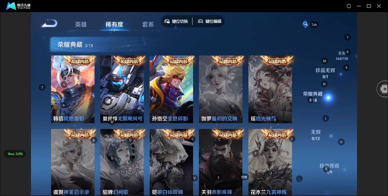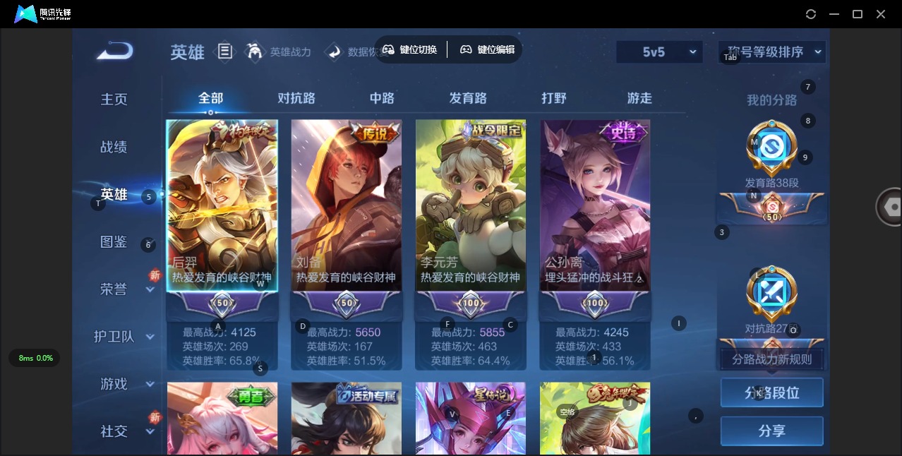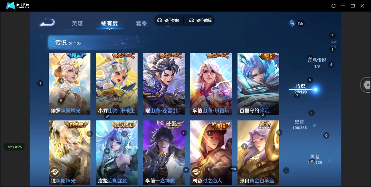 - [12164599]V8 15传说 124英雄 272皮肤 可修改实名 优质装备:冠军飞将,云鹰飞将(小将军),猫影幻舞,久胜战神,炽阳神光,一念神魔,末日机甲-孙尚香(绿蚂蚱),游龙清影(小青龙),超时空战士-狄仁杰 珍宝阁皮:优雅恋人,蔷薇恋人 限定皮:至尊宝,白虎志(电光耗子),傲雪梅枪,寅虎·展翼(孙膑年限),白鹤梁神女,时雨天司(水龙头),神威(电光马子),飞衡(韩信年限),高山流水,五谷丰年,幽恒(沐浴露),武圣,梁祝,御风骁将(吕布年限),奔雷神使(牛魔年限),祈雪灵祝(雪兔子),天狼绘梦者,李小龙,朱雀志(守约年限),如梦令-嫦娥,如梦令-后羿,霸王别姬-项羽,霸王别姬-虞姬,默契交锋-兰陵王,默契交锋-花木兰,猪悟能,冰霜恋舞曲,匿光追影者,寅虎·心曲(虎婆) 史诗皮:百相守梦-黄忠,紫霞仙子,黄金分割率,千年之狐,冰冠公主,魅语,电玩·爆裂旋风,晚萤,偶像歌手,猫狗日记-孙策,时之恋人-孙尚香,乱世虎臣,修罗,摇滚巨星,水果甜心,绅士熊喵,天才门将,功夫厨神,德古拉伯爵,暗隐猎兽者,鬼剑武藏,地狱岩魂,诗语江南,纤云弄巧,繁星吟游(呼啦呼啦),拒霜思,逐浪之夏,龙鼓争鸣,曙光守护者,金属风暴,原初追逐者,圣诞恋歌,鹰眼统帅,魅力维加斯,黎明之约