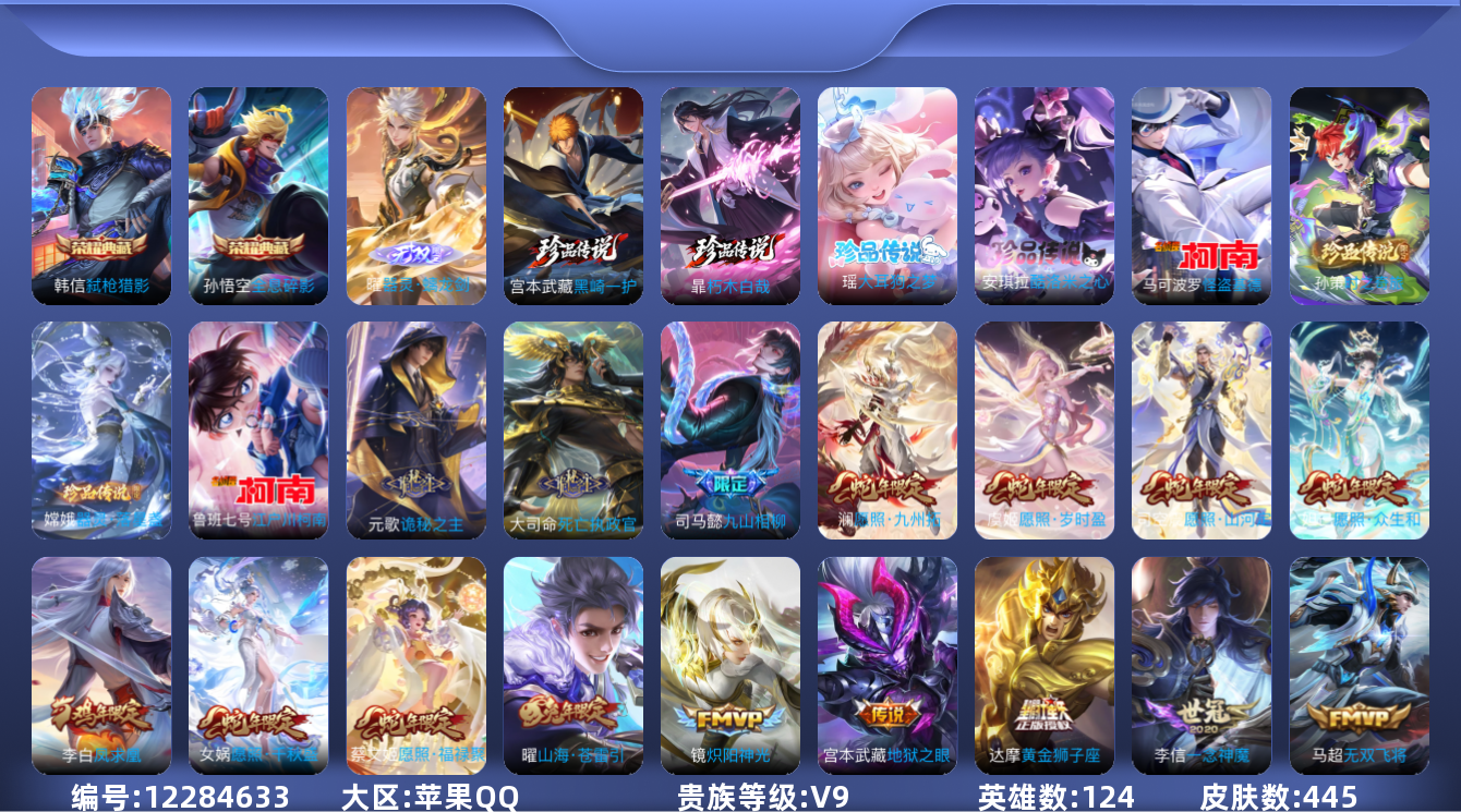 [12284633]V9 2典藏 1无双 8珍品传说 36传说 124英雄 445皮肤 可修改实名 优质装备:全息碎影(猴子典藏),弑枪猎影(韩信典藏),器灵·螭龙剑,江户川柯南,怪盗基德,器灵·落星盏,酷洛米之心,大耳狗之梦,朽木白哉,黑崎一护,黄金狮子座,黄金射手座,冠军飞将,黄金白羊座,炽阳神光,一念神魔,地狱火,仲夏夜之梦(大飞蛾),零号·赤焰,地狱之眼,音你心动-周瑜,胖达荣荣,时之恋人-刘备(电焊工),淬星耀世,超时空战士-狄仁杰,末日机甲-孙策,无双飞将,神器·狴犴令,山海·苍雷引(电光曜子),玄雷天君,诡秘之主,涂山容容 珍品传说:时之奇旅-孙策 传说皮:死亡执政官,九山相柳,星之鸣奏,幻光神枪 珍宝阁皮:万物之道,女武神,玩趣恶龙 限定皮:愿照·九州拓(澜年限),愿照·福禄聚(蔡文姬年限),愿照·岁时盈(虞姬年限),愿照·山河定(司空震年限),愿照·众生和(妲己年限),愿照·千秋盛(女娲年限),逐霄战戟,陌上桑,鸣野蒿,至尊宝,凤求凰(白切鸡),傲雪梅枪,白晶晶,时雨天司(水龙头),神威(电光马子),飞衡(韩信年限),高山流水,怒海麟威,五谷丰年,天狼狩猎者,逐梦之星,岱宗(典韦年限),奔雷神使(牛魔年限),天狼绘梦者,李小龙,如梦令-后羿,孙行者,猪悟能,大圣娶亲,青春决赛季,云端筑梦师,寅虎·御盾(廉颇年限),时之祈愿-云中君,百木心枪,山海·玄木吟(马可年限),冰霜神祇 史诗皮:赞萌露比,鸭鸭历险记-刘禅,飞车小橘子,苍鳞隐世,器灵·浮梦炉,糖绘人间,狼魂孤将,化蝶舞,灵蛊蚀心,星界战将,龙之律动,雪豹·霜爪,藏狐·褐绒,石田雨龙,百相守梦-周瑜,茶境仙,幻珠鲛人,破空之剑,百相守梦-百里守约,百相守梦-黄忠,织梦人,守夜人,紫霞仙子,苍穹之光,电玩小子(小书包),黄金分割率,特工魅影,千年之狐,永昼,江河有灵,魅语,高渐离燃音魔法,蒙恬荣光圣徽,无限星赏官,冰冠公主,青蛇,偶像歌手,白蛇,晚萤,电玩·爆裂旋风,百相守梦(刘备),暗夜猫娘,末日机甲-吕布,猫狗日记-孙策,猫狗日记-大乔,时之恋人-孙尚香,乱世虎臣,节奏热浪,修罗,女仆咖啡,摇滚巨星,水果甜心,绅士熊喵,天才门将,星夜王子,心灵骇客,时之奇旅-安琪拉,功夫厨神,德古拉伯爵,暗隐猎兽者,幽灵船长,鬼剑武藏,暗渊魔法,心灵战警,乐园奇幻夜,天秀·启明,舞动绿茵,地狱岩魂,纤云弄巧,繁星吟游(呼啦呼