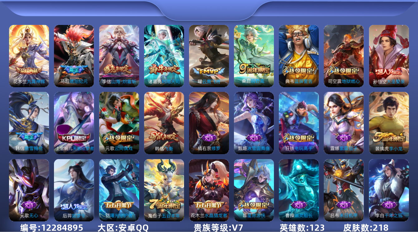 [12284895]V7 1典藏 5传说 123英雄 218皮肤 可修改实名 优质装备:九霄神辉(木兰典藏),云鹰飞将(小将军),山海·炽霜斩(李信年限),琥珀纪元马超 珍宝阁皮:胡桃夹子,蔷薇恋人 限定皮:鸣野蒿,傲雪梅枪,时雨天司(水龙头),飞衡(韩信年限),五谷丰年,游园惊梦,天狼绘梦者,李小龙,如梦令-后羿,大圣娶亲 史诗皮:星界战将,紫霞仙子,特工魅影,千年之狐,江河有灵,百解令(蒙犽),高渐离燃音魔法,蒙恬荣光圣徽,冰冠公主,偶像歌手,龙骑士(小龙虾),末日机甲-吕布,乱世虎臣,节奏热浪,修罗,摇滚巨星,水果甜心,星夜王子,心灵骇客,功夫厨神,暗隐猎兽者,幽灵船长,鬼剑武藏,心灵战警,地狱岩魂,纤云弄巧,缤纷独角兽,乘风破浪,逐浪之夏,水晶猎龙者,曙光守护者,金属风暴,原初追逐者,圣诞恋歌,鹰眼统帅,魅力维加斯,黎明之约,无心,未来纪元-赵云