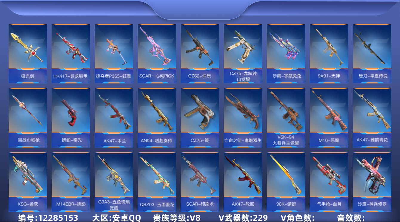 [12285153]可二次 可修改实名 V8 27王者武器 229英雄武器 691万化 大师S 武器:王者之圣,王者之势,王者之影,王者之心,王者之力,王者之蝶,王者之烈,AWM-妙才,M4A1-仲达,AK47-奉先,M4A1-星象,MK47-仁德,激昂霸王枪,CZ75-策,KSG-孟获,81式-光明之神,MR1-龙吟惊沧海,王者之魂,王者之电,王者之刺,COP 357-星象,COP 357-堕天神,巴雷特-变色龙,巴雷特-极光,巴雷特-毁灭,M4A1-堕天神,M4A1-机械迷城,AK47-黑武士觉醒,AK47-无影,AK47-火麒麟,AK47-木兰,AK47-天使,M4A1-死神,M4A1-雷神,M4A1-黑龙,QBZ03-金色蔷薇,QBZ19-天使,QBB95-极光,斯泰尔-幻兽,双持斯泰尔-天使,MK5-极光,MK5-机械纪元,KSG-黑骑士,COP 357-旗袍,巴雷特-冬灭觉醒,巴雷特-枪娘,M4A1-赛博雷神,M4A1-运输船,M4A1-心动次元觉醒,AK47-麒麟,AK47-耀金伯爵,AK47-冰魂觉醒,AK47-雷麒麟,AK47-黑鲨,AK47-猩红传说,AK47-心动次元觉醒,AK47-幸运日觉醒,AK47-血武士,AK47-沙漠郡主-二觉,AK47-华夏传说,M4A1-卧龙,M4A1-樱龙·超觉,M4A1-玫瑰精灵,M4A1-君威GS,暗杀神,剑齿虎-炫彩,9A91-天神,SCAR-幽暗骑士,AN94-四凶觉醒,剑齿虎,QBZ03-枪娘,98K-蜻蜓,M14EBR-拂影,SCAR-印刷术,QCW05-变形金刚·大黄蜂,CZS2-心动次元,寒霜烈龙,PP19野牛-造纸术,地狱火,CZS2-血月,打击者-天神,AK47-破空冰刃,AK47-雷霆王者,AK47-轮回,地狱烈樱·超觉,AA12-火药,地狱烈炎,KSG-火力竞放觉醒,AA12-火药觉醒,嗜血金鲨,M1216-血月,QBZ03-玉面羞花,MK47-鼓龙,G3A3-五色琉璃觉醒,加特林-蟒蛇,刘易斯-血月,加特林-堡垒,VSK-94-九黎兵主觉醒,MG3-雏凤,AN94-赳赳秦师,柯尔特-仲达,AK47-雅韵青花,蟒蛇-奉先,亡命之徒-鬼魅双生,铁锹-孟德,虎头湛金枪,方天画戟,白骨利刃,尼泊尔-星象,穷奇铁扇,M16-恶魔,CZ75-龙映钟山觉醒,QSZ92-华夏传说,沙鹰-无影,沙鹰-修罗,沙鹰-宇航兔兔