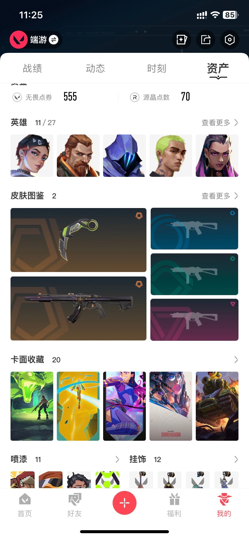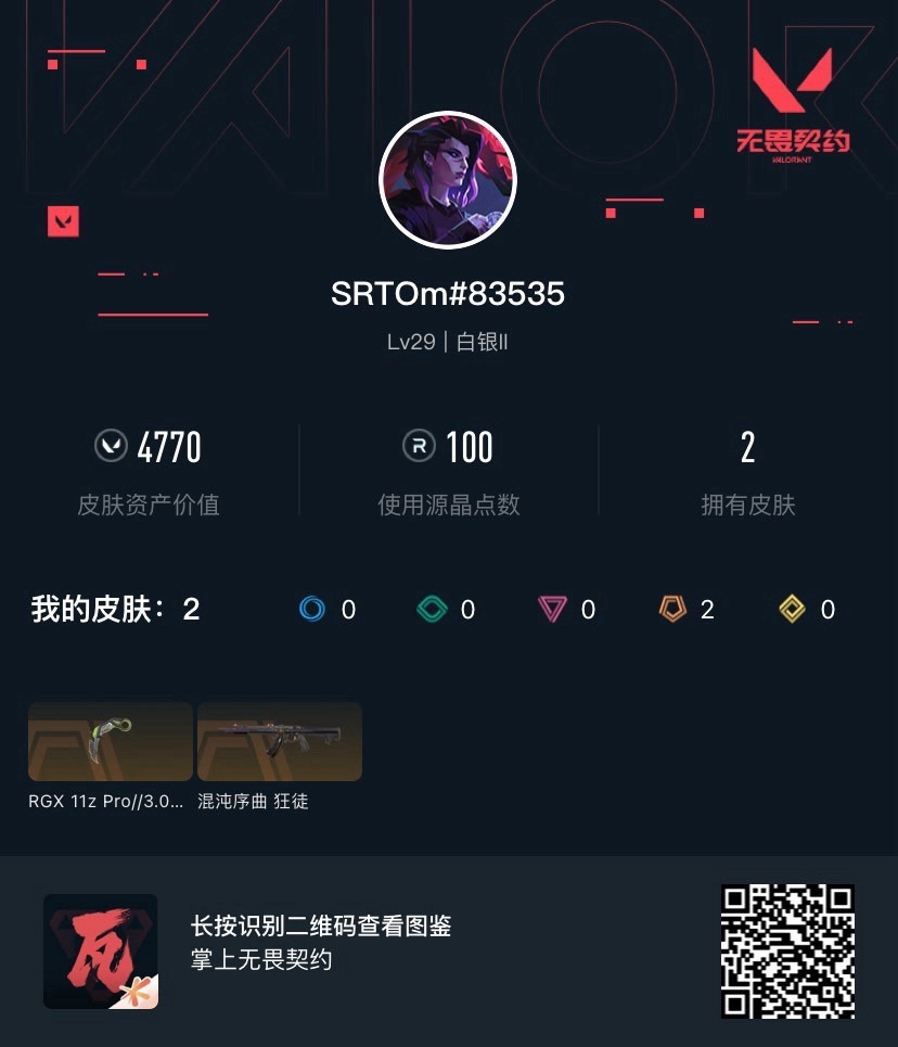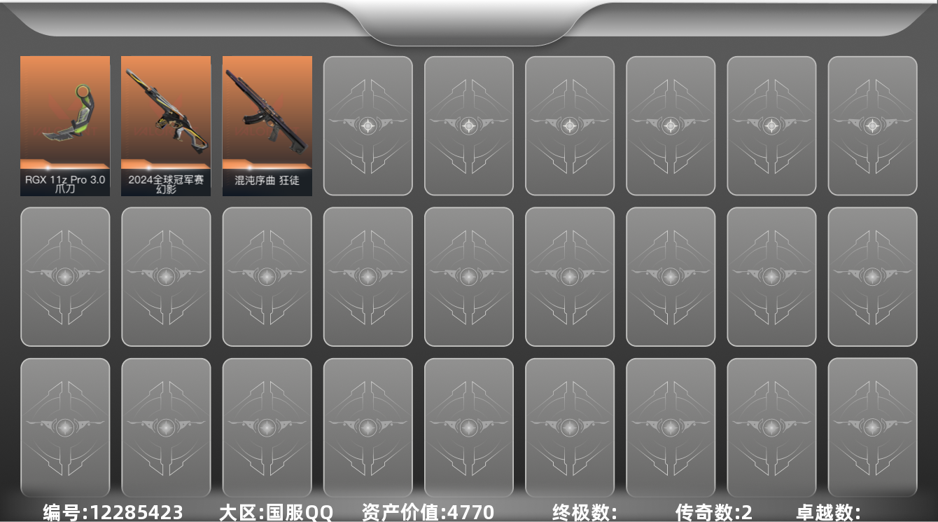 [12285423]2橙皮 2皮肤 11英雄 20卡面 100已用源晶 白银 优质装备:幻影-2024全球冠军赛,狂徒-混沌序曲,爪刀-RGX 11z Pro 3.0