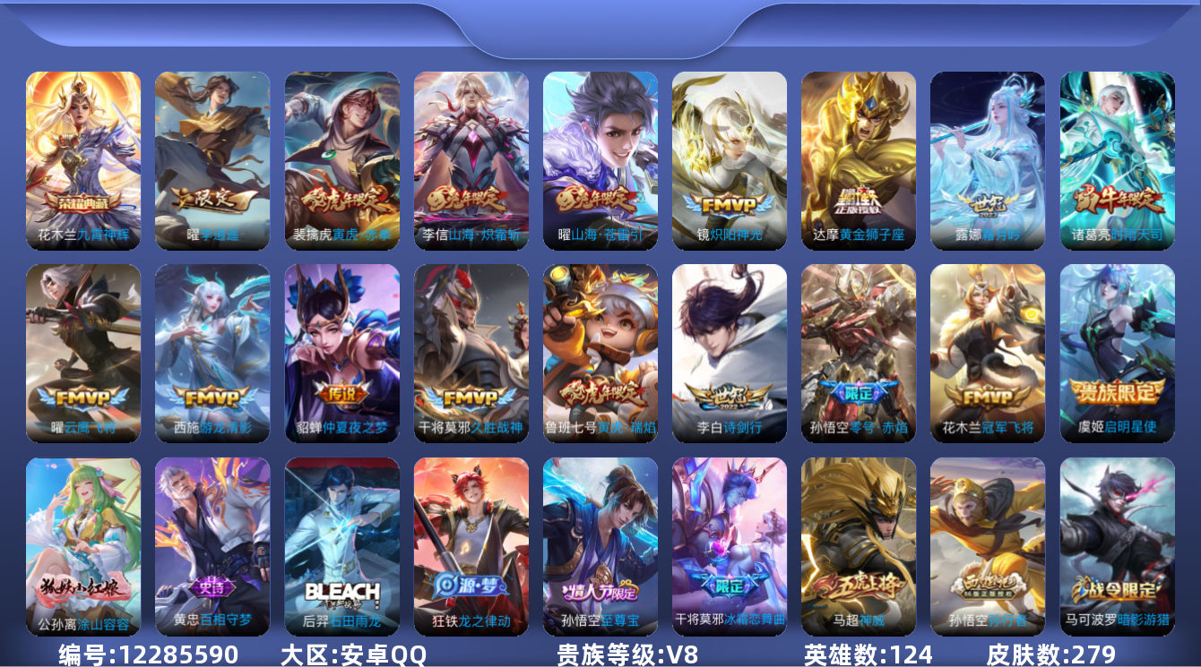 [12285590]V8 1典藏 17传说 124英雄 279皮肤 可修改实名 优质装备:九霄神辉(木兰典藏),黄金狮子座,冠军飞将,云鹰飞将(小将军),久胜战神,炽阳神光,仲夏夜之梦(大飞蛾),零号·赤焰,李逍遥,游龙清影(小青龙),山海·炽霜斩(李信年限),山海·苍雷引(电光曜子),霜月吟,涂山容容 珍宝阁皮:妄想食味,胡桃夹子,优雅恋人 限定皮:至尊宝,傲雪梅枪,时雨天司(水龙头),神威(电光马子),飞衡(韩信年限),瑞麟志(木兰年限),高山流水,诗剑行,五谷丰年,青龙志(铠年限),冰锋战神,游园惊梦,梁祝,御风骁将(吕布年限),李小龙,逐梦之影,孙行者,青春决赛季,冰霜恋舞曲,寅虎·瑞焰(虎皮蛋子),寅虎·赤拳(老虎年限),山海·玄木吟(马可年限) 史诗皮:龙之律动,石田雨龙,百相守梦-黄忠,紫霞仙子,特工魅影,千年之狐,江河有灵,魅语,电玩·爆裂旋风,偶像歌手,末日机甲-吕布,猫狗日记-孙策,乱世虎臣,节奏热浪,修罗,女仆咖啡,摇滚巨星,水果甜心,绅士熊喵,天才门将,星夜王子,心灵骇客,功夫厨神,德古拉伯爵,暗隐猎兽者,幽灵船长,鬼剑武藏,暗渊魔法,心灵战警,舞动绿茵,地狱岩魂,拒霜思,乘风破浪,逐浪之夏,水晶猎龙者,金属风暴,原初追逐者,圣诞恋歌,鹰眼统帅,暗夜贵公子,魅力维加斯,黎明之约,无心,未来纪元-赵云