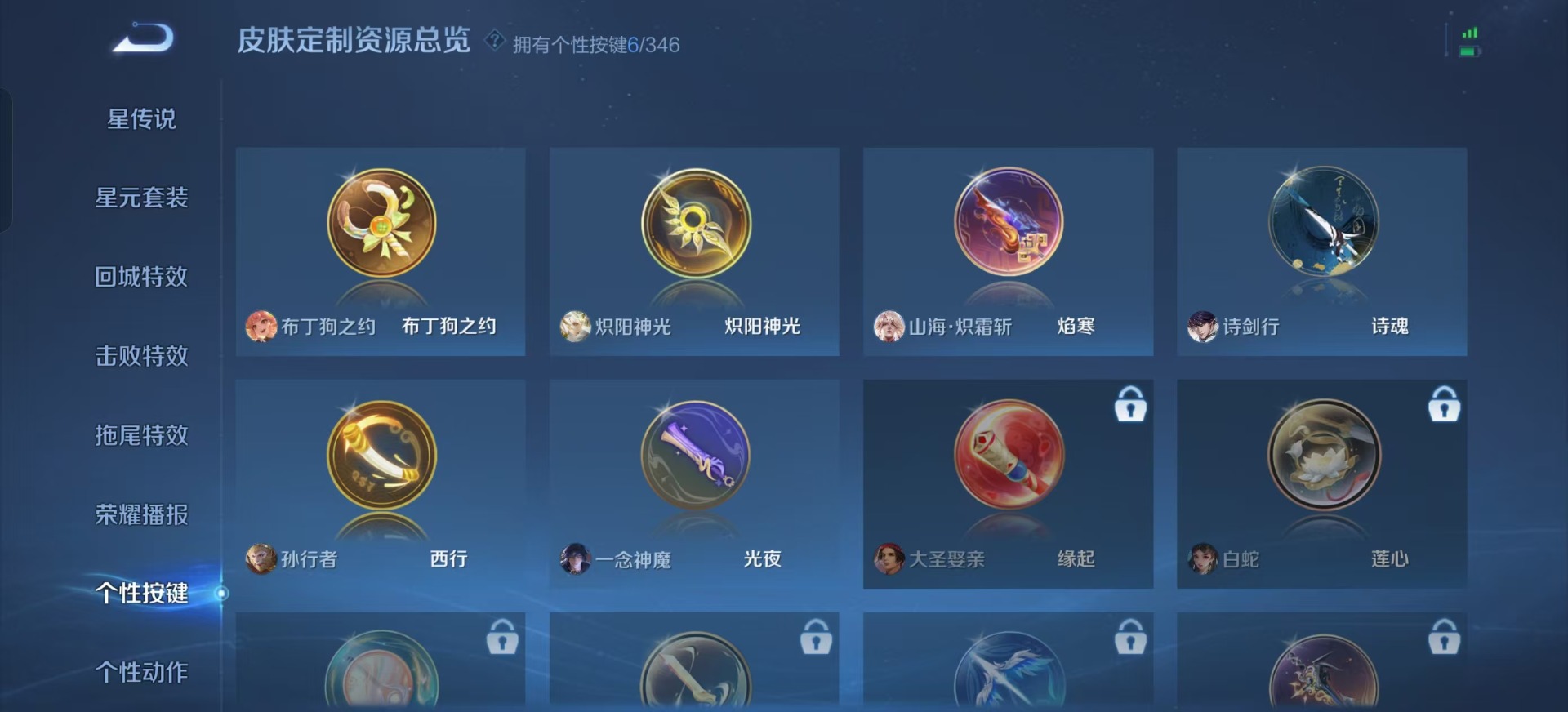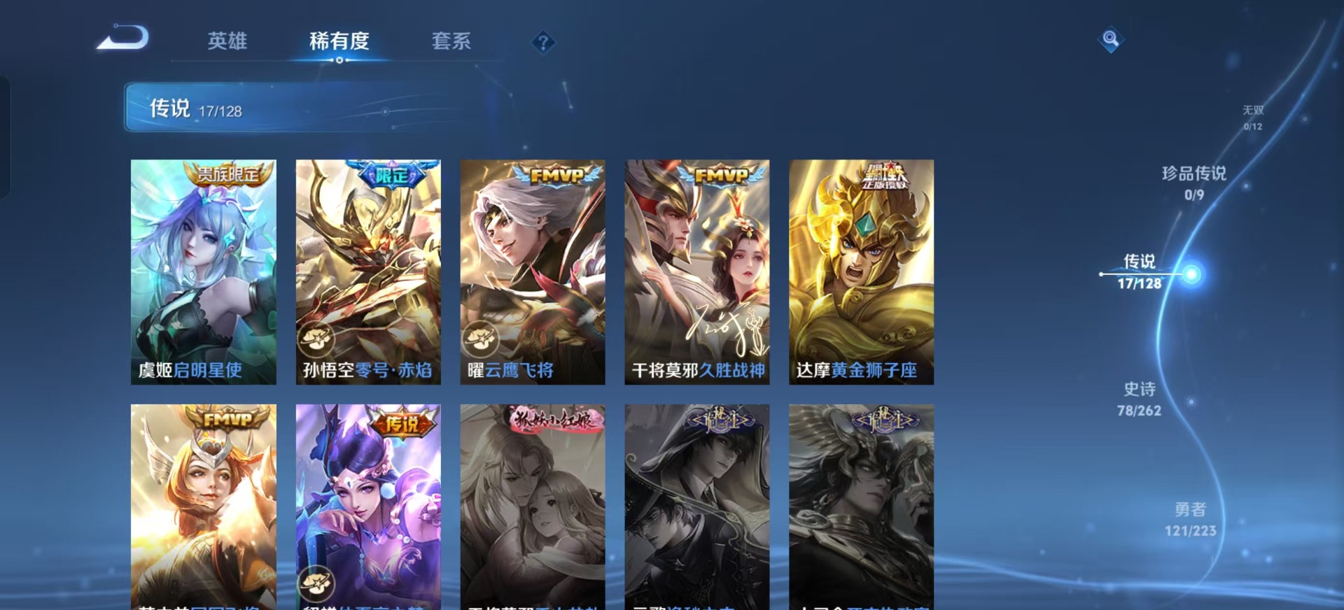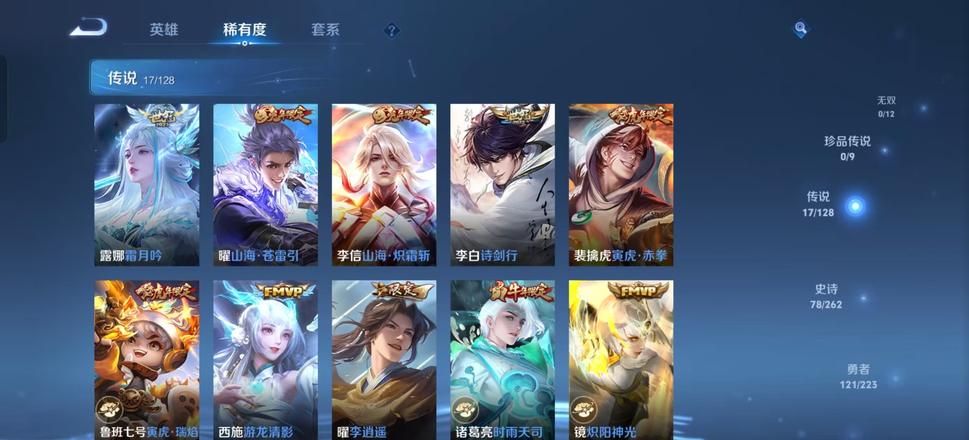 铠青龙志,干将莫邪冰霜恋舞曲,鲁班七号寅虎·瑞焰,吕布御风骁将,诸葛亮时雨天司,裴擒虎李小龙,裴擒虎寅虎·赤拳,上官婉儿梁祝,李白诗剑行,花木兰瑞麟志,花木兰青春决赛季,马可波罗山海·玄木吟,孙悟空孙行者,孙悟空至尊宝,马超神威,韩信傲雪梅枪,韩信飞衡,韩信逐梦之影,关羽冰锋战神