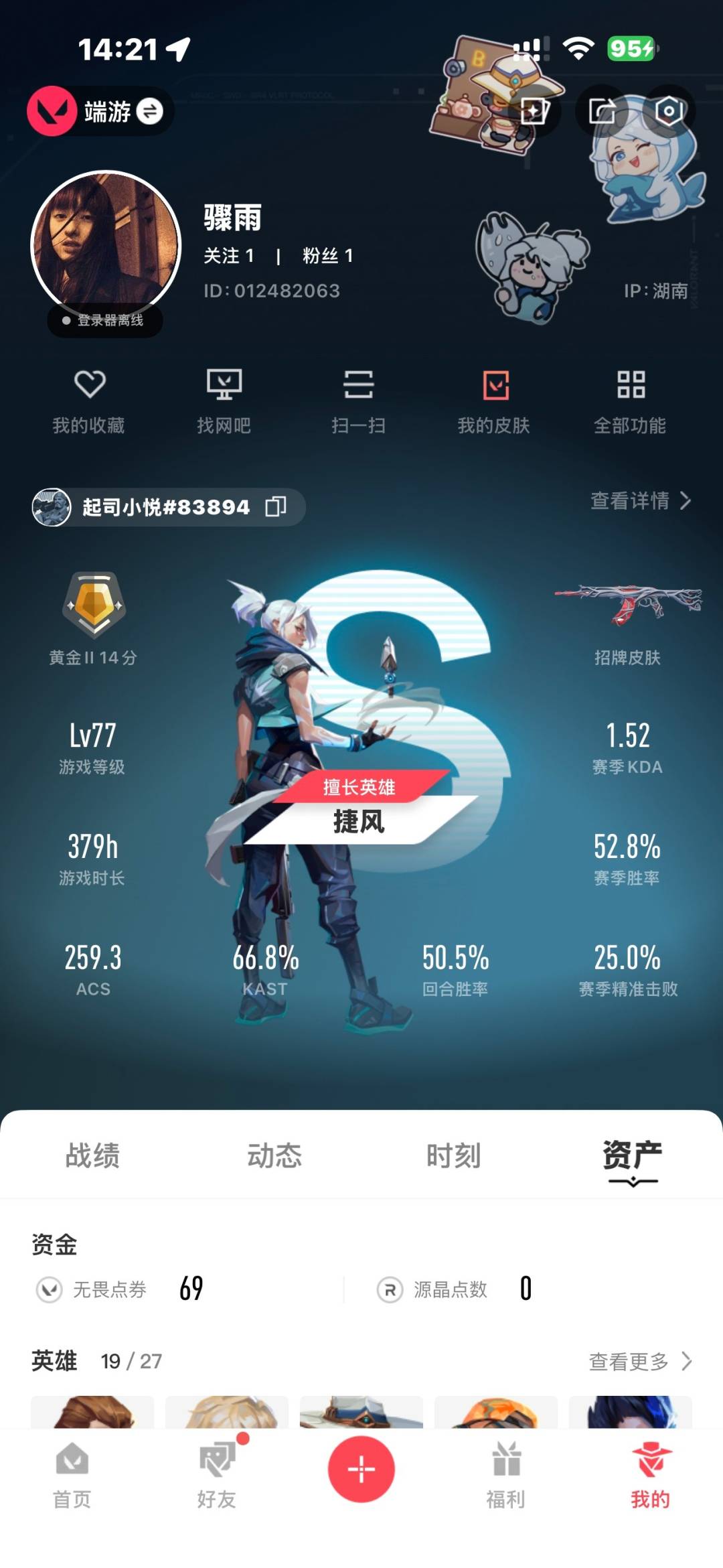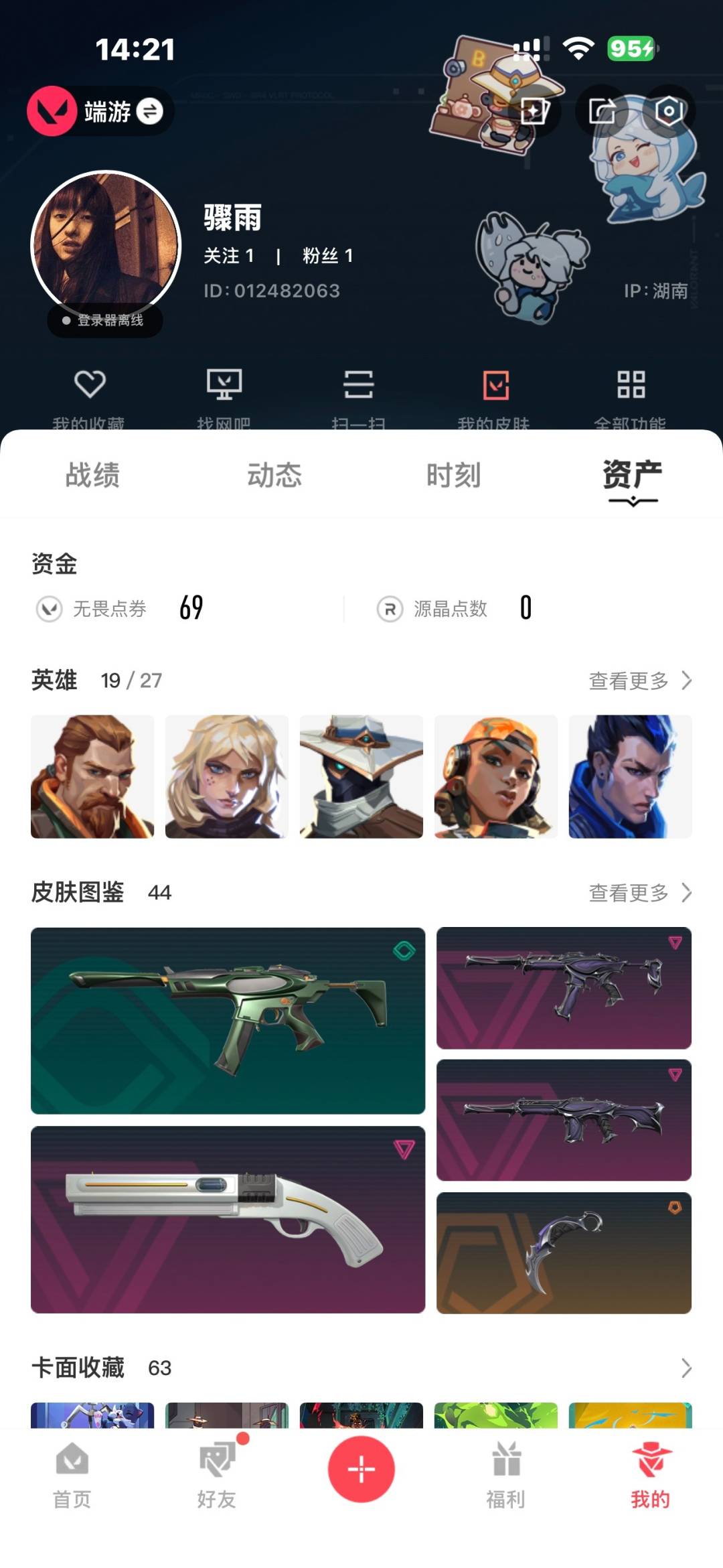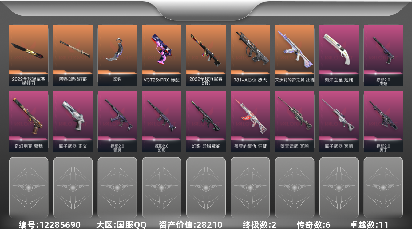 [12285690]6橙皮 2金皮 11紫皮 44皮肤 19英雄 63卡面 635已用源晶 黄金 优质装备:狂徒-艾沃莉的梦之翼,狂徒-盖亚的复仇,獠犬-781-A协议,冥驹-堕天遗武,正义-离子武器,冥驹-离子武器,鬼魅-奇幻朋克,阿特拉斯指挥部,影钩 亮点皮肤:幻影-2022全球冠军赛,2022全球冠军赛 蝴蝶刀 套装:掠影2.0套装,2022全球冠军赛 佩枪皮肤:标配-VCT25xPRX,鬼魅-掠影2.0,短炮-海洋之星 冲锋枪皮肤:骇灵-掠影2.0 步枪皮肤:幻影-异鳞魔蛇,幻影-掠影2.0 机枪皮肤:奥丁-掠影2.0