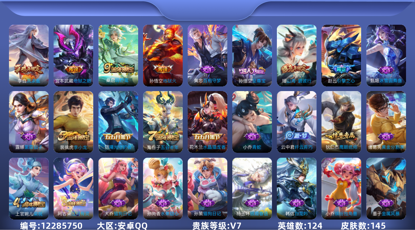 - [12142741]V9 3典藏 16传说 125英雄 264皮肤 典藏英雄武则天 可修改实名 优质装备:无限飓风号(高达),大秦宣太后,鸣剑·曳影,黄金射手座,冠军飞将,云鹰飞将(小将军),猫影幻舞,炽阳神光,一念神魔,云霓雀翎,末日机甲-孙尚香(绿蚂蚱),海洋之心,李逍遥,淬星耀世,山海·苍雷引(电光曜子) 珍宝阁皮:优雅恋人,女武神 限定皮:逐霄战戟,鸣野蒿,至尊宝,异界灵契(白毛香),傲雪梅枪,飞衡(韩信年限),遇见飞天,高山流水,五谷丰年,青龙志(铠年限),冰锋战神,天狼运算者,梁祝,天狼狩猎者,李小龙,朱雀志(守约年限),辉光之辰,如梦令-嫦娥,如梦令-后羿,霸王别姬-项羽,霸王别姬-虞姬,孙行者,一生所爱,引擎之心,天魔缭乱,云端筑梦师,乒乒小将,女儿国国王,寅虎·御盾(廉颇年限) 史诗皮:紫霞仙子,苍穹之光,电玩小子(小书包),黄金分割率,永昼,魅语,冰冠公主,偶像歌手,晚萤,猫狗日记-孙策,时之恋人-孙尚香,乱世虎臣,节奏热浪,修罗,女仆咖啡,水果甜心,绅士熊喵,天才门将,星夜王子,心灵骇客,功夫厨神,德古拉伯爵,暗隐猎兽者,幽灵船长,鬼剑武藏,舞动绿茵,地狱岩魂,纤云弄巧,繁星吟游(呼啦呼啦),拒霜思,缤纷独角兽,逐浪之夏,龙鼓争鸣,水晶猎龙者,曙光守护者,金属风暴,原初追逐者,圣诞恋歌,鹰眼统帅,王者之锤,魅力维加斯,黎明之约,寅虎·御盾,未来纪元-赵云