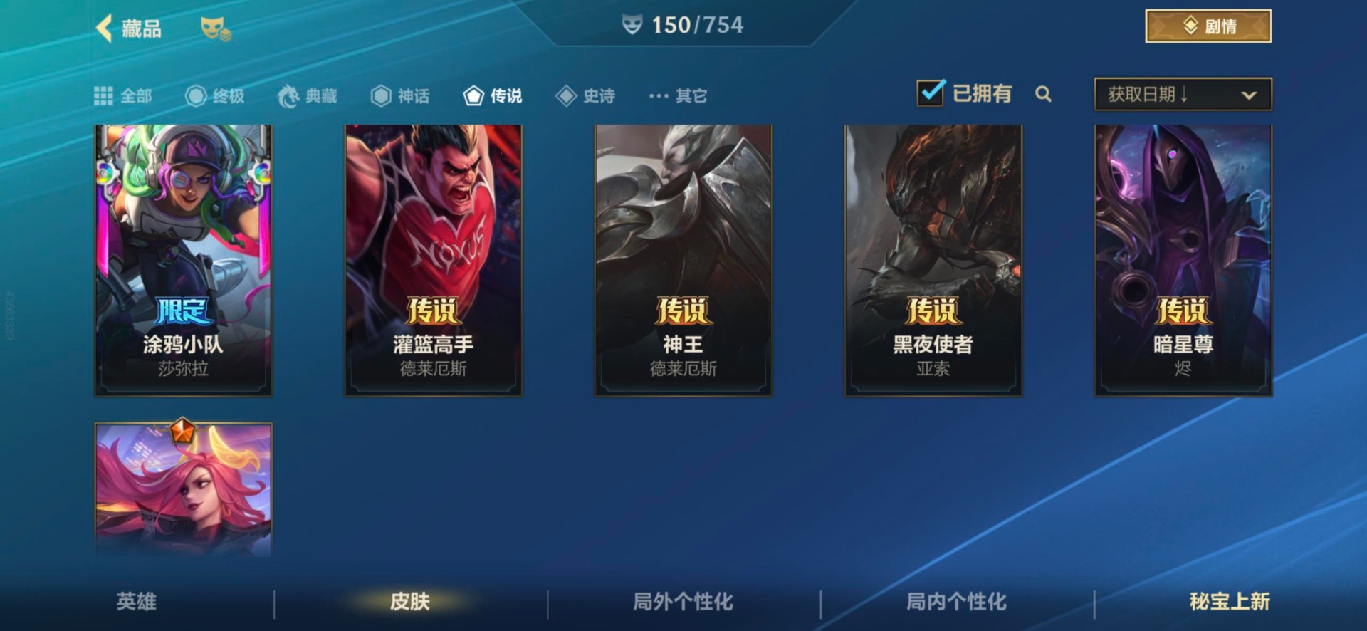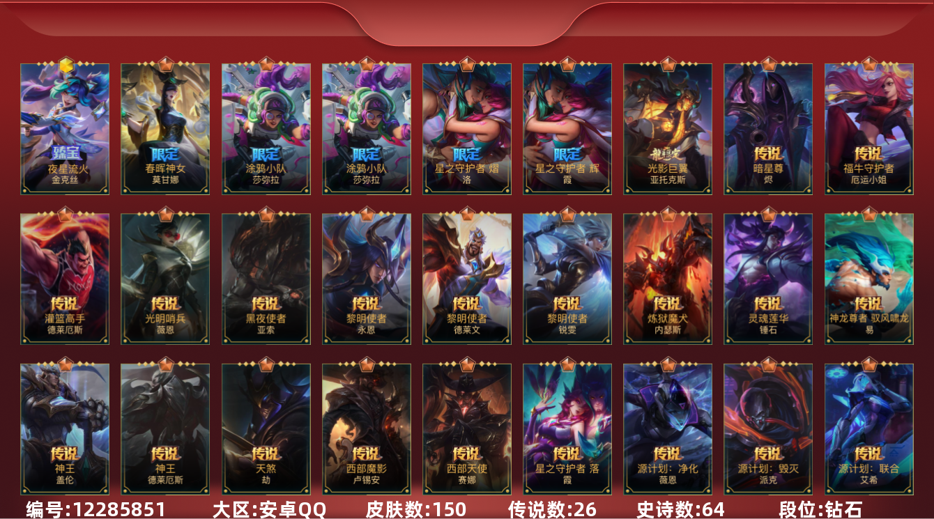 [12285851]1神话 4限定 26传说 64史诗 150皮肤 可二次 可修改实名 优质装备:暗星尊,福牛守护者女枪,灌篮高手,光明哨兵薇恩,黑夜使者亚索,黎明使者锐雯,炼狱魔犬,神龙尊者 驭风啸龙,神王盖伦,神王诺手,天煞劫,西部魔影卢锡安,西部天使赛娜,星之守护者 落,源计划:净化,源计划:联合,战斗学院ez,灵魂莲华锤石,涂鸦小队莎弥拉,灵魂莲华腕豪,心之钢凯隐 段位:钻石 神话皮:夜星流火 金克丝 限定皮肤:星之守护者霞,星之守护者洛,涂鸦小队莎弥拉,山海绘卷剑魔 传说皮:黎明使者德莱文,春晖神女莫甘娜,光影巨翼亚托克斯,源计划:毁灭,黎明使者永恩