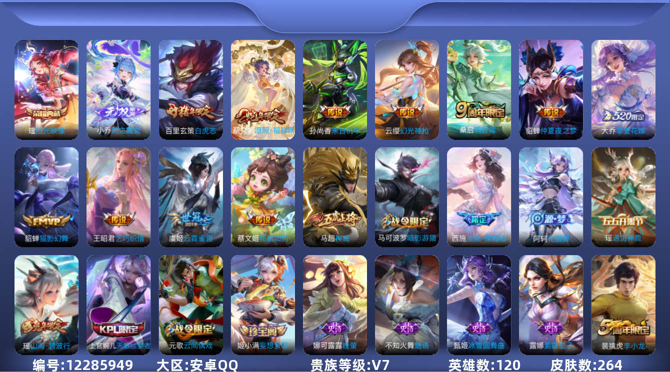 [12285949]V7 1典藏 1无双 11传说 120英雄 264皮肤 可修改实名 优质装备:小乔时之魔女(小乔无双),拾光映像(瑶典藏),猫影幻舞,云霓雀翎,末日机甲-孙尚香(绿蚂蚱),仲夏夜之梦(大飞蛾),乞巧织情,花朝如约(花篮子),挚爱花嫁 传说皮:幻光神枪 珍宝阁皮:妄想食味,蔷薇恋人,女武神 限定皮:愿照·福禄聚(蔡文姬年限),鸣野蒿,白虎志(电光耗子),寅虎·展翼(孙膑年限),神威(电光马子),山海·碧波行(瑶年限),至美·乘鲤谣,遇见飞天,高山流水,五谷丰年,天狼运算者,游园惊梦,天狼绘梦者,李小龙,霸王别姬-虞姬,云端筑梦师 史诗皮:化蝶舞,星界战将,奇遇星旅,蔬乡物语(鲁班七号),遇见神鹿,紫霞仙子,黄金分割率,特工魅影,江河有灵,魅语,蒙恬荣光圣徽,无限星赏官,冰冠公主,青蛇,偶像歌手,白蛇,晚萤,电玩·爆裂旋风,猫狗日记-孙策,猫狗日记-大乔,时之恋人-孙尚香,乱世虎臣,女仆咖啡,摇滚巨星,水果甜心,绅士熊喵,天才门将,星夜王子,心灵骇客,功夫厨神,暗隐猎兽者,幽灵船长,鬼剑武藏,心灵战警,舞动绿茵,诗语江南,纤云弄巧,繁星吟游(呼啦呼啦),拒霜思,缤纷独角兽,乘风破浪,逐浪之夏,水晶猎龙者,箭羽风息,金属风暴,原初追逐者,圣诞狂欢,圣诞恋歌,鹰眼统帅,魅力维加斯,黎明之约