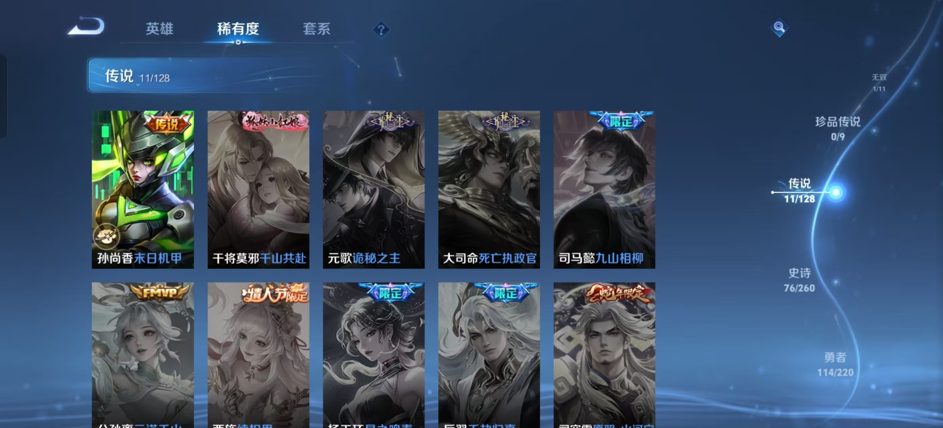 - PX_2060207-【金标不知火舞,金标干将莫邪,金标百里守约,金标鬼谷子,金标孙策】贵族等级:,V9,英雄数:,122,皮肤数:,308,荣耀水晶:,武则天,鸣剑·曳影,星传说:,幻海之心,金色仲夏夜,传说皮:,黄金狮子座,黄金射手座,云鹰飞将,绛天战甲,猫影幻舞,久胜战神,炽阳神光,一念神魔,云霓雀翎,末日机甲-孙尚香,地狱火,仲夏夜之梦,零号·赤焰,海洋之心,地狱之眼,时之恋人-刘备,遇见