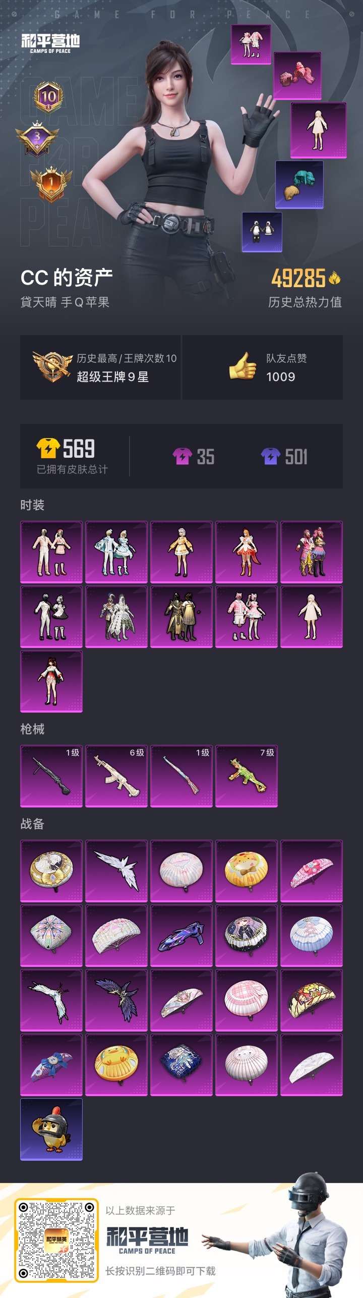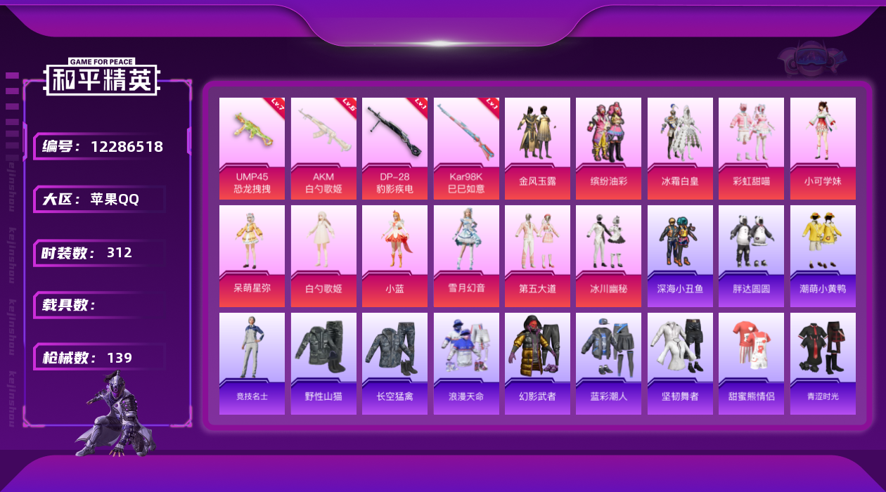 [12286518]11粉装 4特效枪 10印记 可二次 可修改实名 优质装备:金风玉露,缤纷油彩(猪妹猪脸妹),冰霜白皇,AKM白勺歌姬,UMP45恐龙拽拽,七级UMP45-恐龙拽拽,雪月幻音,Kar98K-巳巳如意 热门装扮:彩虹甜喵,冰川幽秘,第五大道,呆萌星弥,白勺歌姬,小可学妹,小蓝,胖达圆圆,潮萌小黄鸭,深海小丑鱼 稀有枪皮:DP-28-豹影疾电 六级特效枪:六级AKM-白勺歌姬 一级特效枪:一级Kar98K-巳巳如意,一级DP-28-豹影疾电 紫色装扮:田园牧歌,轻风白浪,和煦暖阳,SS22特训,SS23特训,幻彩翩翩,灵蜜圈圈,妙红点点,白兰地假日,娇憨猪猪,梦幻奶油,樱桃黑巧,萌趣咩咩,暖心熊熊,SS21特训,SS31特训套装,极速光影,SS30特训套装,云朵鹅,雪绒豹,SS33特训套装,青涩时光,顶瓜瓜,怪笑疯兔,SS19特训,粉团憨憨,野性山猫,长空猛禽,蓝彩潮人,蓝海鲸歌,飞行日记,鹤鸣,麻辣教官,龙的传人,龟仙人,龙魂突击队,香桃花海,涂山之恋,幻影武者,坚韧舞者,破蛋小黄鸡,甜蜜熊情侣,牛气满满,萝兰蝴蝶,纯真浪花,热情海星,迎夏光舞,暗影刺翼,异域银装,鱼渊荷华,玉兔迎春,燕燕于飞,都市丽猫,青团波波,糖糖葫芦,竞技名士,情公主,惊鸿侠骨,甜梦熊熊,神气柴柴,懵萌河马,SS24特训(SS24特训套装),SS25特训,月光变奏,绝对偶像,锦衣飞扬,舰行太空,无暇誓言,浪漫天命,淡雅花蕊,大橘大利,纯白誓言,SS32特训服(SS32特训套装),青玉碎影,绯格组合,萌黄之夏,光之冒险 优质战备:精灵梦叶罗丽降落伞,镜光幻境飞行器(镜光幻境飞行翼),萌物绒绒降落伞,时光之吻降落伞,动力核心飞行器,戏水时光降落伞,星月云朵降落伞,樱桃泡泡降落伞,月下星之子降落伞,彩虹独角兽降落伞,星夜魔法师降落伞,飞行翼-星夜魔法师,垂柳戏鸭降落伞,白勺歌姬降落伞,纯梦嫁纱降落伞,第五大道降落伞,甜心宝贝降落伞,童趣迷兔降落伞,洛神天依降落伞,飞行器-天之羽翼