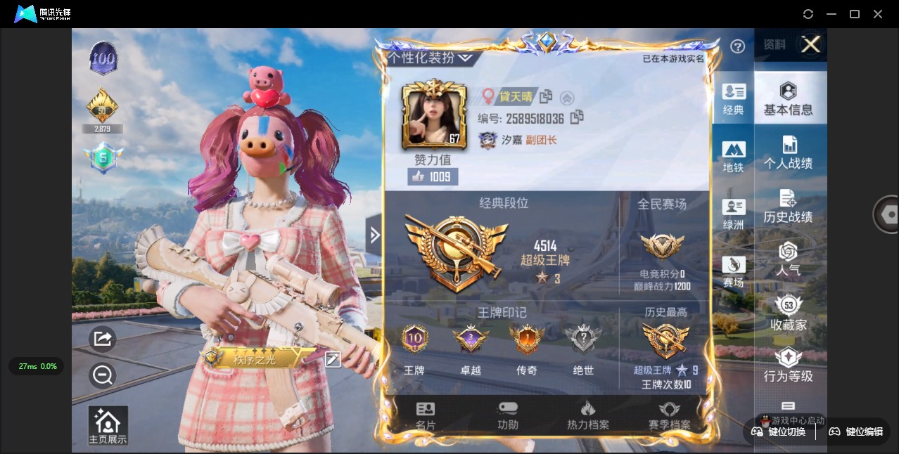 - [12090240]4粉装 9特效枪 2载具 4印记 可二次 可修改实名 身法装备:初号机 觉醒Ver.(新紫螳螂),8号机(新粉螳螂),Mark.06(新蓝螳螂) 优质装备:阿斯顿·马丁DBS(红),路特斯ELETRE(冰川蓝),香水柠檬,Groza香水柠檬,P90-电糖天使,M416墨龙九天,六级M416-墨龙九天,AMR鸢尾晶梦,M200梦海之灵,UMP45量子极限,M762-青锋波束,Kar98K-巳巳如意 热门装扮:齐天大圣,星空武士,初号机 觉醒Ver.(新紫螳螂),迅捷狂鲨,呆萌铁蟹 稀有枪皮:DP-28-豹影疾电 六级特效枪:六级GROZA-香水柠檬 五级特效枪:五级M762-青锋波束,五级UMP45-量子极限,五级AMR-鸢尾晶梦 四级特效枪:四级Kar98K-巳巳如意 三级特效枪:三级P90-电糖天使,三级M200-梦海之灵,三级DP-28-豹影疾电 紫色装扮:SS31特训套装,旭日情侣,SS30特训套装,SS33特训套装,顶瓜瓜,冰爽海盐,浪漫樱花,军刀雅典娜,长空猛禽,雪山精英,蜜露汐语,魅力单车,龟仙人,冰河战士,龙魂突击队,蝶变,香桃花海,暗金炫舞,猛禽,小熊娃娃,雏菊兔兔,萝兰蝴蝶,SS29特训,极冰使者,星途旅人,纯真浪花,热情海星,曼妙人鱼,卖崽青蛙,铁血战翼,8号机(新粉螳螂),Mark.06(新蓝螳螂),冰公主,异域银装,竞技名士,粉红小猪,焰鹰斗篷,幻羽潜行,大橘大利,SS32特训服(SS32特训套装),绯格组合,光之冒险 优质战备:鸢尾晶梦降落伞,霓虹漫游降落伞,绮梦流光降落伞,墨龙九天降落伞,龙翔九天飞行器,精灵梦叶罗丽降落伞,初号机 觉醒Ver.降落伞,星途旅人降落伞,深渊漩涡飞行器,江南烟雨降落伞,香水柠檬降落伞