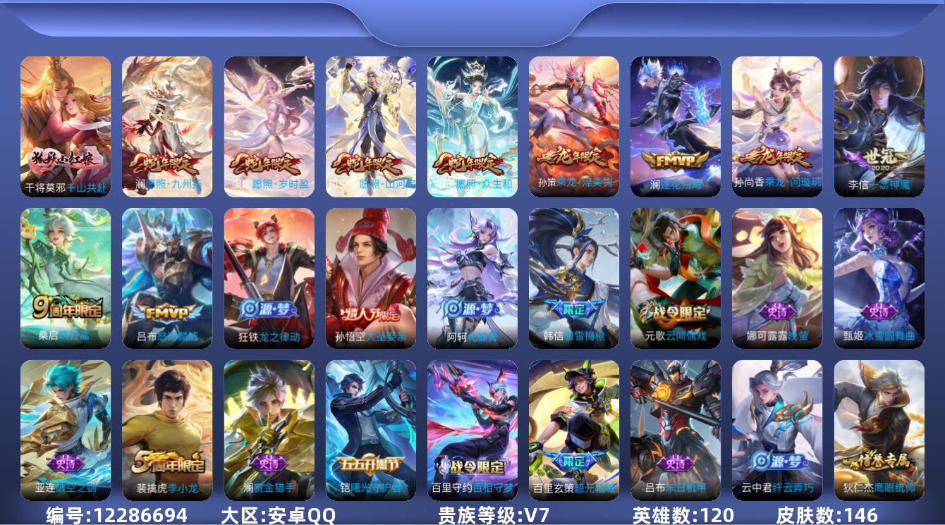 [12286694]V7 11传说 120英雄 146皮肤 可修改实名 优质装备:一念神魔,澜逐花归海,千山共赴 传说皮:乘龙·问璇玑(孙尚香年限),乘龙·淬吴钩(孙策年限) 珍宝阁皮:胡桃夹子,蔷薇恋人 限定皮:愿照·九州拓(澜年限),愿照·岁时盈(虞姬年限),愿照·山河定(司空震年限),愿照·众生和(妲己年限),鸣野蒿,傲雪梅枪,怒海麟威,李小龙,大圣娶亲 史诗皮:化蝶舞,龙之律动,茶境仙,怒海争锋,破空之剑,超元猎域,百相守梦-百里守约,苍穹之光,白龙吟,特工魅影,偶像歌手,晚萤,末日机甲-吕布,乱世虎臣,节奏热浪,摇滚巨星,水果甜心,暗隐猎兽者,鬼剑武藏,心灵战警,纤云弄巧,乘风破浪,逐浪之夏,曙光守护者,箭羽风息,圣诞狂欢,圣诞恋歌,鹰眼统帅,魅力维加斯,赏金猎手,未来纪元-赵云