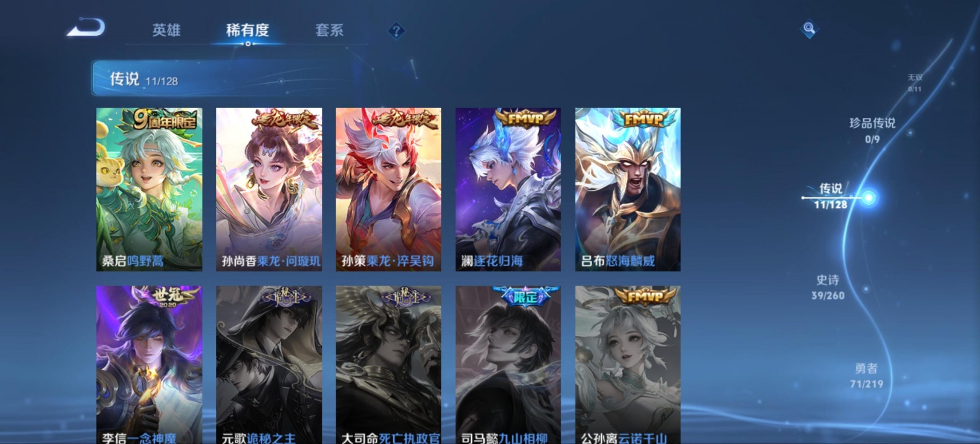 - PX_2102983-Q/至尊星耀/129皮肤/123英雄/0典藏/0珍品无双/0无双/0珍品传说/2传说/32史诗/7稀有英雄 【2 传说皮肤】逐花归海 澜,愿照·山河定 司空震, 【32 史诗皮肤】白昼王子 嬴政,高山流水 庄周,苍穹之光 项羽,德古拉伯爵 刘邦,鬼剑武藏 宫本武藏,星夜王子 白起,遇见飞天 杨玉环,摇滚巨星 嬴政,偶像歌手 王昭君,鹰眼统帅 狄仁杰,大圣娶亲 孙悟空,李小龙