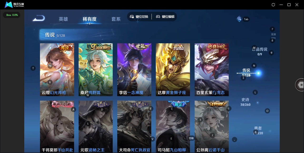 - [11884062]V7 1典藏 9传说 125英雄 235皮肤 可修改实名 优质装备:神鉴启示录,冠军飞将,炽阳神光,音你心动-小乔,胖达荣荣,大乔-时之奇旅 珍宝阁皮:蔷薇恋人,女武神 限定皮:凤凰于飞,星穹之声,白鹤梁神女,山海·碧波行(瑶年限),遇见飞天,诗剑行,无限倾心-虞姬,五谷丰年,梁祝,孙行者,乒乒小将,女儿国国王,时之祈愿-瑶(瑶传限),匿光启智者,时之奇旅-妲己,山海·玄木吟(马可年限) 史诗皮:化蝶舞,琥珀纪元伽罗,遇见神鹿,紫霞仙子,苍穹之光,黄金分割率,江河有灵,匿光侦查者,雪夜绮愿(周瑜),百解令(蒙犽),高渐离燃音魔法,蒙恬荣光圣徽,无限星赏官,匿光破解者,青蛇,晚萤,电玩·爆裂旋风,猫狗日记-孙策,时之恋人-孙尚香,乱世虎臣,女仆咖啡,水果甜心,天才门将,时之奇旅-安琪拉,功夫厨神,暗隐猎兽者,幽灵船长,鬼剑武藏,地狱岩魂,纤云弄巧,繁星吟游(呼啦呼啦),拒霜思,逐浪之夏,水晶猎龙者,曙光守护者,箭羽风息,金属风暴,圣诞狂欢,圣诞恋歌,鹰眼统帅,暗夜贵公子,魅力维加斯,奇遇舞章,天秀·音浪,无心