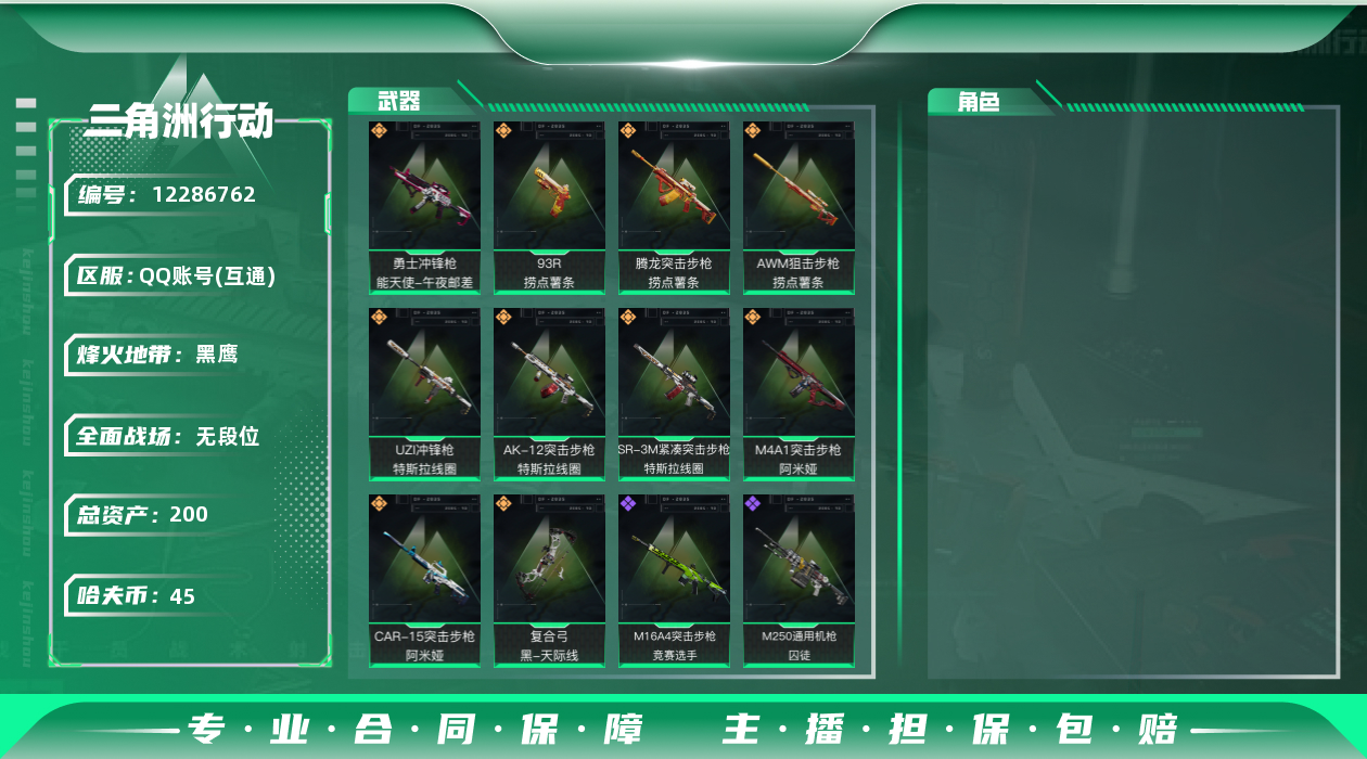 - [11852698]总资产:628.7M 11传说枪械 哈夫币:208K 顶级安全箱(3×3)9.15号到期 可二次 可修改实名 优质装备:顶级安全箱(3x3) 烽火地带段位:黑鹰 全面战场段位:上等兵 传说武器皮肤:UZI冲锋枪-特斯拉线圈,AWM狙击步枪-捞点薯条,腾龙突击步枪-捞点薯条,93R-捞点薯条,AK-12突击步枪-特斯拉线圈,SR-3M紧凑突击步枪-特斯拉线圈,勇士冲锋枪-能天使-午夜邮差,复合弓-黑-天际线,M4A1突击步枪-阿米娅,CAR-15突击步枪-阿米娅,AK-12突击步枪-夜鹰 史诗武器皮肤:AUG突击步枪-蝮蛇,SG552突击步枪-尖端治疗,QJB201轻机枪-Old Habits,M1014霰弹枪-林中猎手,PKM通用机枪-守夜人,AS Val突击步枪-尖端治疗,M700狙击步枪-守夜人,Ash-12战斗步枪-守夜人,SR-25射手步枪-尖端治疗,勇士冲锋枪-深海恐惧,AKM突击步枪-林中猎手,M16A4突击步枪-竞赛选手,M250通用机枪-囚徒,SV-98狙击步枪-林中猎手,PTR-32突击步枪-英雄,SV-98狙击步枪-囚徒,Vector冲锋枪-阿萨拉文明,M700狙击步枪-竞技风,P90冲锋枪-紧急戒备