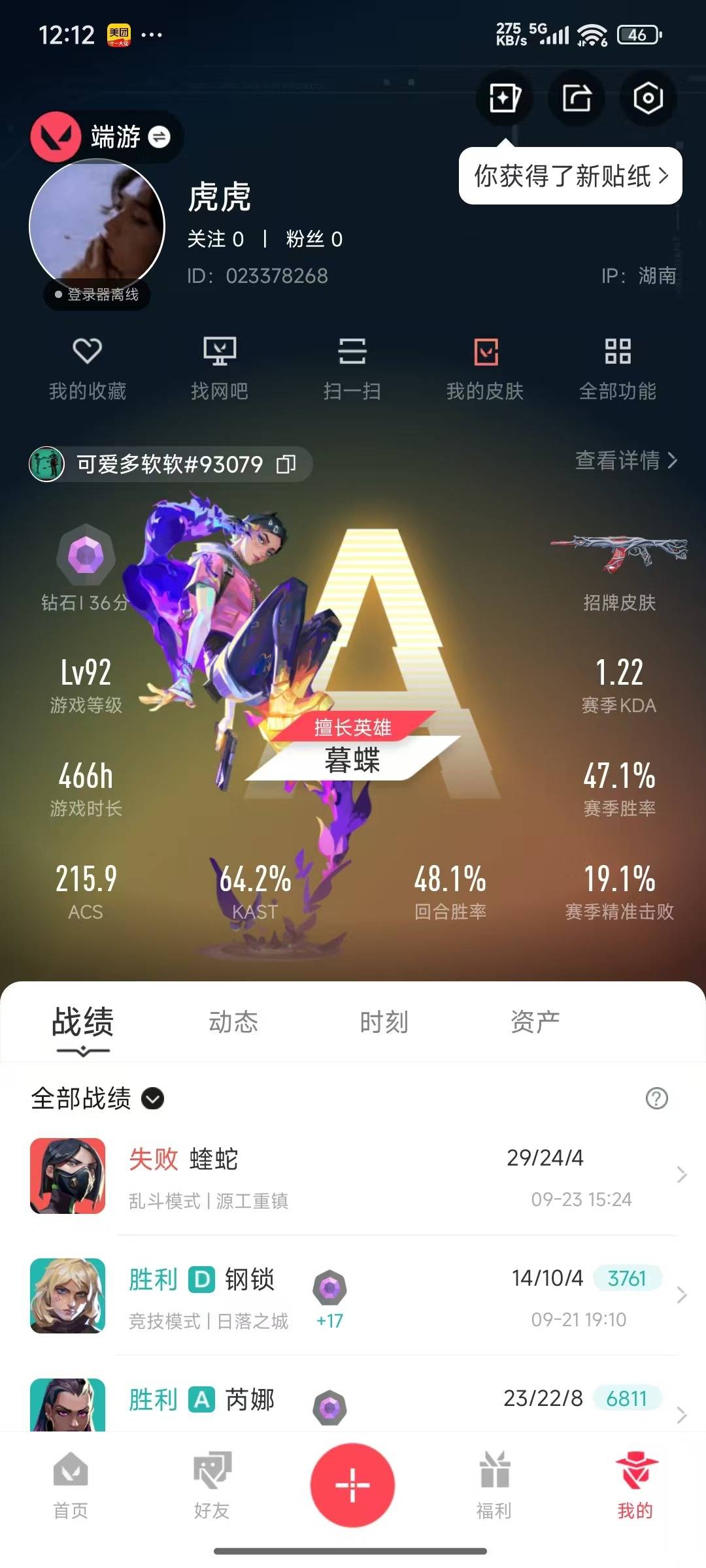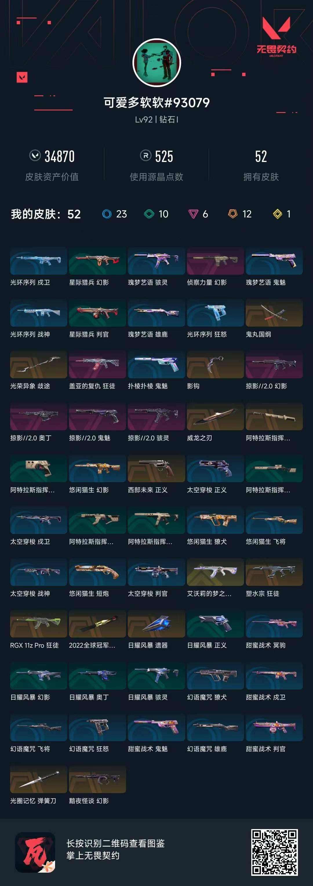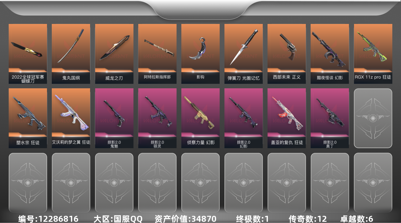 [12286816]12橙皮 1金皮 6紫皮 52皮肤 16英雄 53卡面 525已用源晶 钻石 优质装备:狂徒-塑水宗,狂徒-艾沃莉的梦之翼,狂徒-盖亚的复仇,幻影-侦察力量,幻影-黯夜怪谈,威龙之刃,弹簧刀-光圈记忆,鬼丸国纲,阿特拉斯指挥部,影钩 亮点皮肤:2022全球冠军赛 蝴蝶刀 套装:掠影2.0套装 佩枪皮肤:鬼魅-掠影2.0,正义-西部未来 冲锋枪皮肤:骇灵-掠影2.0 步枪皮肤:幻影-掠影2.0,RGX 11z pro 狂徒 机枪皮肤:奥丁-掠影2.0