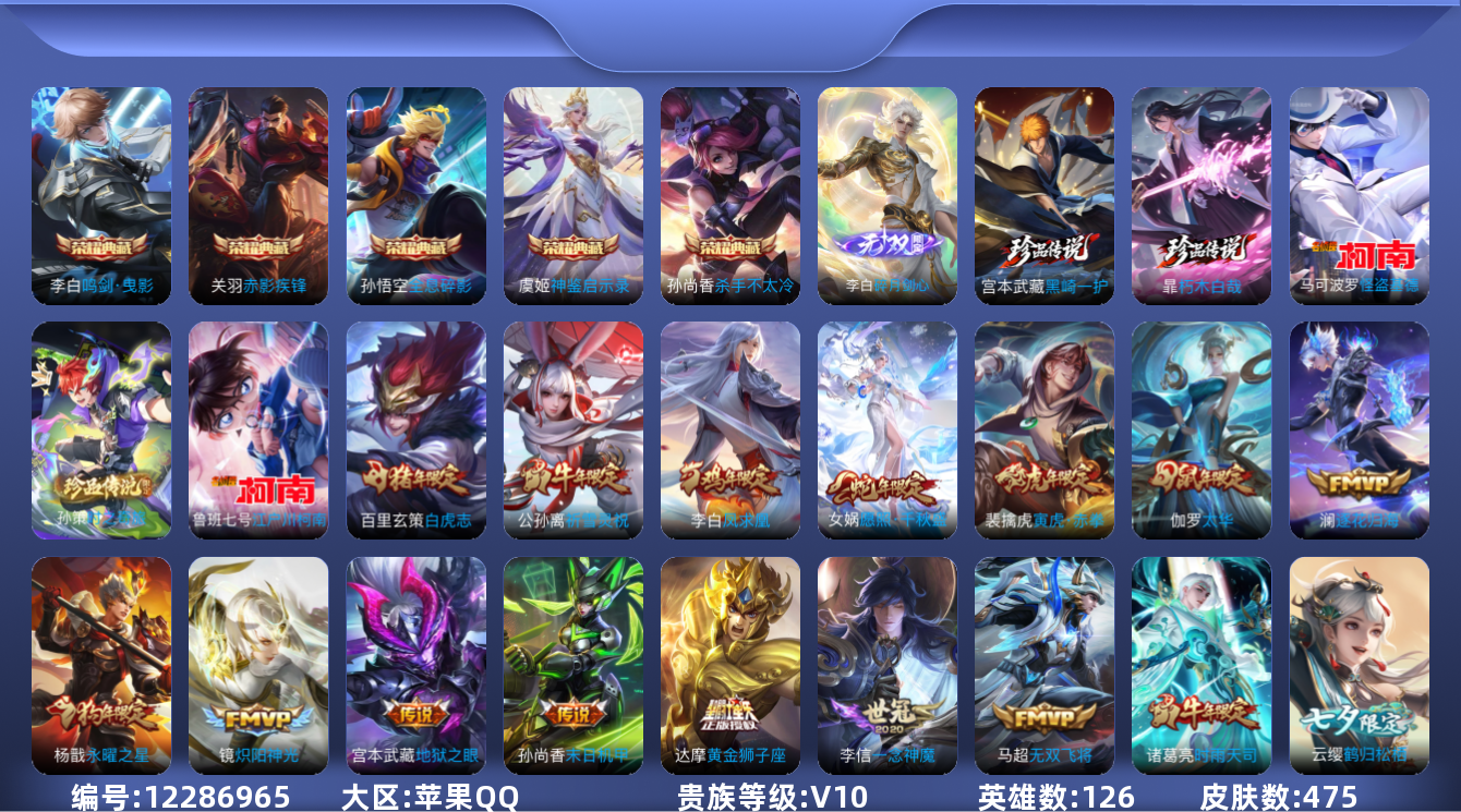 [12286965]V10 5典藏 1无双 5珍品传说 47传说 126英雄 475皮肤 典藏英雄武则天 可修改实名 优质装备:杀手不太冷,鸣剑·曳影,全息碎影(猴子典藏),赤影疾锋,碎月剑心(李白无双),神鉴启示录,江户川柯南,怪盗基德,朽木白哉,黑崎一护,黄金狮子座,黄金射手座,冠军飞将,云鹰飞将(小将军),黄金白羊座,猫影幻舞,久胜战神,炽阳神光,一念神魔,云霓雀翎,末日机甲-孙尚香(绿蚂蚱),地狱火,仲夏夜之梦(大飞蛾),音你心动-小乔,零号·赤焰,海洋之心,地狱之眼,飞鸢探春,胖达荣荣,乞巧织情,时之恋人-刘备(电焊工),游龙清影(小青龙),淬星耀世,超时空战士-狄仁杰,遇见胡旋,末日机甲-孙策,挚爱之约,无双飞将,山海·琳琅生(小乔年限),鹤归松栖(云缨),澜逐花归海,艾琳觅芳踪,玄雷天君,涂山容容 珍品传说:时之奇旅-孙策 传说皮:幻光神枪 珍宝阁皮:万物之道,蔷薇恋人,玩趣恶龙 限定皮:愿照·千秋盛(女娲年限),逐霄战戟,鸣野蒿,至尊宝,白虎志(电光耗子),凤求凰(白切鸡),凤凰于飞,太华(伽罗年限),梅西,补天,绯月行,时之彼端,白晶晶,时雨天司(水龙头),神威(电光马子),飞衡(韩信年限),玄嵩(庄周年限),遇见飞天,高山流水,匿光决锋者,五谷丰年,青龙志(铠年限),冰锋战神,幽恒(沐浴露),天狼运算者,梁祝,御风骁将(吕布年限),逐梦之翼,岱宗(典韦年限),天狼溯光者,天狼征服者,奔雷神使(牛魔年限),祈雪灵祝(雪兔子),逐梦之影,逐梦之光,玄武志(苏烈年限),朱雀志(守约年限),永曜之星,辉光之辰,如梦令-后羿,奇迹圣诞,默契交锋-花木兰,真爱至上,孙行者,猪悟能,大圣娶亲,青春决赛季,冰霜恋舞曲,蜜橘之夏,热情桑巴,神奇女侠,美猴王,寅虎·赤拳(老虎年限),启示之音,唐三藏,神器·万象笔 史诗皮:鸭鸭历险记-刘禅,器灵·浮梦炉,狼魂孤将,化蝶舞,灵蛊蚀心,星界战将,龙之律动,雪豹·霜爪,石田雨龙,百相守梦-周瑜,茶境仙,破空之剑,百相守梦-百里守约,百相守梦-黄忠,遇见神鹿,紫霞仙子,苍穹之光,电玩小子(小书包),白龙吟,黄金分割率,特工魅影,千年之狐,永昼,江河有灵,末日机甲-莱西奥,鹤归松栖(赵怀真),雪夜绮愿(周瑜),魅语,百解令(蒙犽),高渐离燃音魔法,蒙恬荣光圣徽,无限星赏官,冰冠公主,青蛇,偶像歌手,白蛇,晚萤,暗夜猫娘,银翎春语,龙骑士(小龙